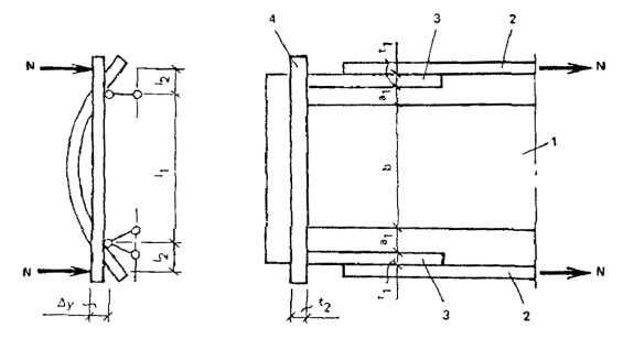 где Es,ad, ls,ad - модуль упругости и длина затяжки. В расчетах усиления железобетонных ферм длину усиливаемого элемента решетки или пояса допускается принимать без учета размеров узла. 3.72. Потери напряжений в затяжке рекомендуется определять по формуле sl,sp = (Dls,ad1 + Dls,ad2) (Es,ad / ls,ad), (71) где Dls,ad1 и Dls,ad2 - деформации анкерных устройств двух концов затяжек, состоящие из начальных Dl0r и упругих Dlel деформации. 3.73. Деформации анкерных устройств при усилении ферм предварительно напряженными затяжками необходимо определять с учетом способа их установки. При установке «насухо» начальные деформации следует принимать по 0,5 мм на каждый анкер, при установке «на раствор» - по 0,25 мм. При обжатии опорных пластин анкерных устройств обжимными болтами нагрузкой с интенсивностью 10 МПа величину Dl0r допускается снижать на 0,25 мм на каждый анкер. Упругие деформации анкерных устройств Dlel при любом способе установки определяются по формуле Dlel = [(DNad l2) / (2Es Js)] / (l1 / 2 + l2 / 2), (72) где DNad - изменения усилия в затяжке при увеличении нагрузки; EsJs - жесткость опорной пластины анкера; l1 = b - 2 t2; (73) l2 = t2 / 2 + a1 + t2, (74) где t1 - толщина боковой пластины анкера; t2 - толщина опорной пластины; a1 - расстояние от поверхности усиливаемого элемента до боковой пластины анкера; b - ширина опорной части усиливаемого элемента (рис. 66). Рис. 66. Расчетная схема и конструкция опорного анкера усиления фермы 1 - усиливаемая конструкция; 2 - затяжка; 3 - боковая пластина; 4 - опорная пластина Упругие деформации анкерных устройств с ребрами жесткости, определенные по формуле (72), следует уменьшать в два раза. 3.74. При усилении элементов нижнего пояса и решетки длиной до 6 м необходимо учитывать влияние упругих деформаций анкерных устройств на напряжение в затяжках. Усиление сжатых элементов металлическими обоймами и распорками3.75. Распределение приращения усилия DN между усиливаемым элементом и обоймой, а также распорками обойменного типа рекомендуется определять по следующим формулам: DNr = [(DN Eb Ared) / (Eb Ared + Es,rin As,rin)] j; (75) DNrin = [(DN Es,rin As,rin) / (Es,rin As,rin + Eb Ared)] δinc j, (76) где DNr - приращение усилия в усиливаемом элементе; DNrin - то же, в обоймах; Es,rin, As,rin - модуль упругости и площадь сечения ветвей обоймы; δinc - коэффициент неплотности опор, равный 0,5; принимается только для обойм с упором концов в узлы; j - коэффициент продольного изгиба ветвей обоймы, определяемый по главе СНиП II-23-81*. Площадь сечения ветвей обоймы As,rin подбирается методом последовательных приближений. 3.76. При расчете элементов, усиленных односторонними распорками, необходимо учитывать дополнительный изгибающий момент от распорки как в усиливаемом элементе, так и в смежных элементах. 3.77. Распределение приращения усилия DNr и DNcb между усиливаемым элементом и односторонней распоркой рекомендуется определять по следующим формулам: DNr = (DN Eb Ared) / (Eb Ared + Es,cb Acb); (77) DNcb = (DN Es,cb Acb) / [Es,cb Acb + Eb Ared (lcb / l)], (78) где lcb - длина распорки; Ecb, As,cb - модуль упругости и площадь сечения распорки. 3.78. Усилие в распорке от предварительного напряжения DNsp,cb определяется по формуле DNsp,cb = ssp,cb Acb δinc, (79) где δinc - коэффициент неплотности опор, равный 0,5. 3.79. Расчетное усилие в распорке Ncb и дополнительный изгибающий момент в элементе Mad определяются по формулам: Ncb = Nsp,cb + DNcb; (80) Mad = Ncb acb, (81) где acb - расстояние между продольными осями усиливаемого элемента и распорки. 3.80. Проверка сечения распорки производится по нап