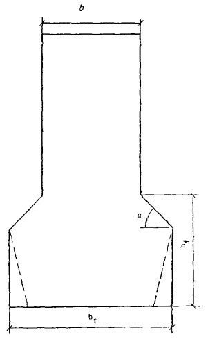 4.3. Конфигурация обойм, рубашек, наращиваний выбирается с учетом возможности применения сварных сеток и каркасов, изготовляемых на точечных машинах в заводских условиях, а также обеспечения возможности применения простой по конструкции и удобной в эксплуатации опалубки, в том числе несъемной (полностью или частично). 4.4. Размеры обойм, наращиваний и набетонок рекомендуется принимать в зависимости от принятого метода бетонирования с учетом следующих указаний. Рис. 72. Сечение поясов ригелей и балок при усилении наращиванием сечения снизу Усиление нижних поясов ригелей и балок рекомендуется выполнять с уширением в нижней части. Соотношения размеров должны удовлетворять следующим условиям (рис. 72): bf ³ (b + 150) мм; hf ³ 100 мм; hf ³ 1/3 bf. Углы наклона верхней грани набетонки a должны приниматься не менее 15°; при эксплуатации конструкций на открытом воздухе эти углы должны приниматься не менее 45°. При наращивании нижнего пояса балок безопалубочными методами (торкретированием, набрызгом) набетонка выполняется прямоугольного очертания и толщиной не менее 50 мм. Толщина набетонок при усилении плит сверху должна быть не менее 35 мм при укладке бетонной смеси с вибрированием и не менее 25 мм - при торкретировании. Толщина набетонок при устройстве на плитах перекрытий снизу должна быть: при нанесении слоя бетонной смеси торкретированием - не менее 35 мм, а при укладке мелкозернистой бетонной смеси вибрированием с разгрузкой через «окна» - не менее 60 мм; размеры окон должны быть не менее 200 ´ 200 мм с расстоянием между ними 700 мм. При усилении стенок резервуаров и силосов толщина набетонок, устраиваемых в опалубке, должна быть не менее 80 мм, торкретированием и набрызгом - 35 мм. Минимальная толщина обойм при усилении железобетонных колонн по требованиям технологии усиления принимается в зависимости от метода бетонирования. При уплотнении бетонной смеси глубинными вибраторами и высоте щитов опалубки 600 - 800 мм толщина стенки обоймы должна быть не менее 80 мм, а при высоте щитов 1200 мм - не менее 130 мм. При бетонировании обойм литыми бетонными смесями с наружным вибрированием толщина стенок обоймы должна быть не менее 75 мм при высоте щитов опалубки (высоте бетонирования) не менее 1500 мм. При торкретировании минимальная толщина слоя должна быть не менее 50 мм. При усилении металлических конструкций путем обетонирования толщина защитного слоя бетона (для прокатных профилей) должна быть не менее 50 мм. При применении опалубки в виде неразъемных блок-форм, в том числе с навесными вибраторами, технологические уклоны следует принимать не менее 1 : 10. 4.5. При усилении конструкций железобетонными обоймами с жесткой (уголковой) наружной арматурой необходимо у верхнего и нижнего концов обоймы устанавливать прокладки из профильного металла для фиксации положения опорных уголков (см. рис. 11). 4.6. В конструктивных решениях, связанных с применением арматуры, желательно предусматривать бессварочные методы соединения на месте установки: соединение внахлестку, установку угловых сеток и хомутов, применение бессварочных проволочных элементов и т.п. Конструкция каркасов и сеток должна обеспечивать минимальный объем работ по рихтовке, выверке и закреплению в проектном положении, для чего каркасы и сетки в необходимых случаях должны быть снабжены крепежными деталями и фикса