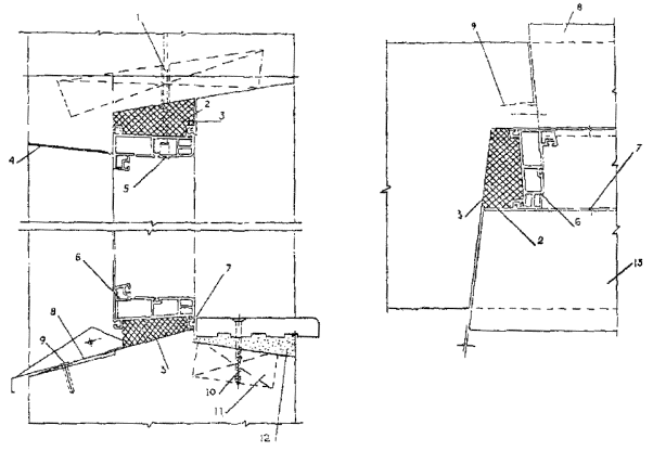 Рис. 1. Схема установки оконного блока в проемы стеновой панели наружных стен: 1 - гвоздь, забитый в заранее просверленное отверстие диаметром 3,5 мм; 2 - наличник; 3 - Вилан-405; 4 - окраска откосов; 5 - декоративная круглая заглушка; 6 - оконная коробка; 7 - герметик; 8 - слив из оцинкованной стали; 9 - дюбель гвоздь с шайбой; 10 - шуруп, завинченный в просверленное отверстие диаметром 4 мм; 11 - деревянная пробка в панели; 12 - цементный раствор; 13 - плита подоконная асбестоцементная экструзионная. Примечание. По периметру оконного блока уплотнить резиновой клеящей лентой.