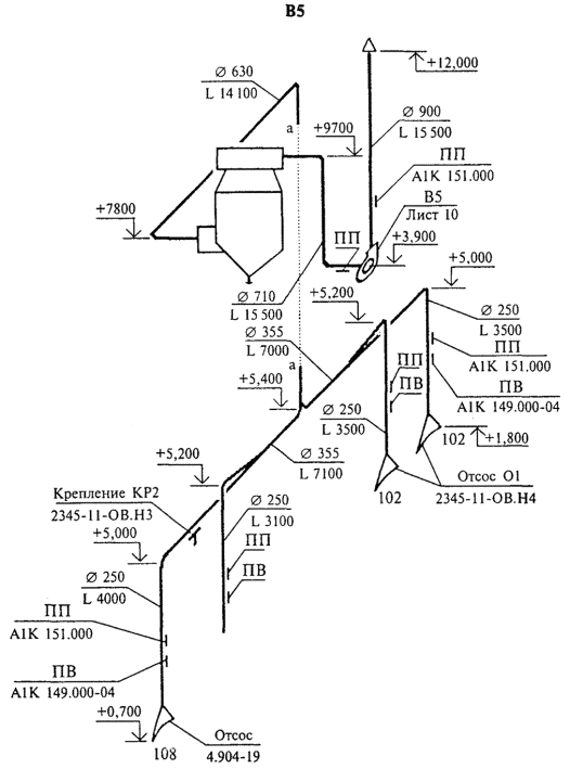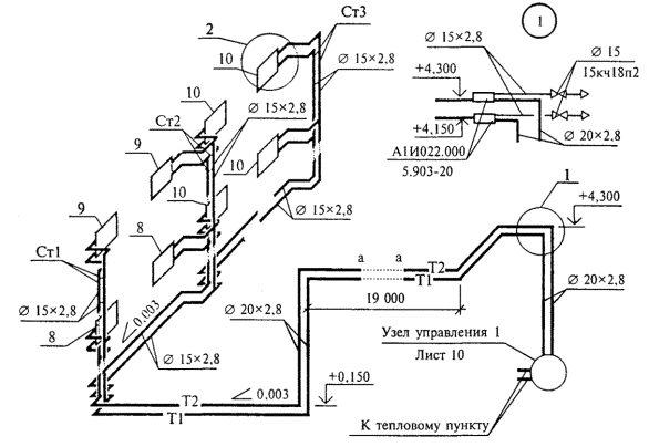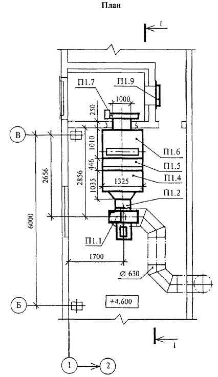 Рисунок В.2 В.2 Пример выполнения разреза чертежей систем приведен на рисунке В.3. Рисунок В.3 ПРИЛОЖЕНИЕ Г(справочное) Примеры выполнения схем систем отопления и теплоснабжения установокГ.1 Пример выполнения схемы системы отопления приведен на рисунке Г.1. Г.2 Пример выполнения схемы системы теплоснабжения установок приведен на рисунке Г.2. Г.3 Пример выполнения схемы узла управления системами отопления и теплоснабжения установок приведен на рисунке Г.3. Г.4 Пример выполнения схемы узла (выносного элемента) системы приведен на рисунке Г.4. Система отопления Рисунок Г.1 Система теплоснабжения установок П1, П2, A1, A2 Рисунок Г.2 Узел управления 1 Рисунок Г.3 Рисунок Г.4 ПРИЛОЖЕНИЕ Д(справочное) Примеры выполнения схем систем вентиляцииД.1 Пример выполнения схемы приточной системы вентиляции приведен на рисунке Д.1. Д.2 Пример выполнения схемы вытяжной системы вентиляции приведен на рисунке Д.2. Рисунок Д.1