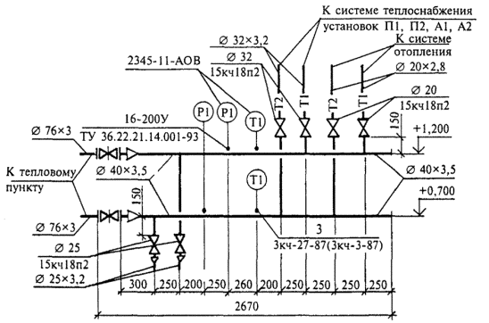 6 Чертежи систем6.1 Планы и разрезы чертежей систем 6.1.1 Изображения - планы и разрезы, фрагменты планов и разрезов и узлы (выносные элементы) на чертежах систем выполняют в масштабах по 4.14. 6.1.2 Планы чертежей систем отопления (теплоснабжения установок) допускается совмещать с планами чертежей систем вентиляции и кондиционирования. Разрезы чертежей систем отопления, как правило, следует совмещать с разрезами чертежей систем вентиляции и кондиционирования. 6.1.3 Дефлекторы, крышные вентиляторы и другие элементы систем, расположенные на кровле здания, наносят, как правило, утолщенной штрихпунктирной линией (наложенная проекция) на плане чертежей систем одноэтажного здания или верхнего этажа многоэтажного здания. При этом сложные вентиляционные установки (например, кондиционеры, приточные и (или) вытяжные установки), расположенные на кровле здания, следует выполнять на отдельном плане кровли. Пример изображения дефлектора (система ВЕ1), расположенного на кровле здания, на плане чертежей систем одноэтажного здания, приведен на рисунке 6. 6.1.4 При сложном многоярусном расположении воздуховодов и других элементов систем вентиляции и кондиционирования в одном этаже для наглядности их взаимосвязей выполняют планы на различных уровнях в пределах этажа. 6.1.5 Трубопроводы, выполненные условными графическими обозначениями (в одну линию) по ГОСТ 21.206 и расположенные друг над другом в одной плоскости (рисунок 7а), на планах чертежей систем условно изображают параллельными линиями в соответствии с рисунком 7б. 6.1.6 Элементы систем отопления и теплоснабжения установок, кроме оборудования, на планах и разрезах чертежей систем указывают условными графическими обозначениями, элементы систем вентиляции и кондиционирования, а также оборудование систем отопления и теплоснабжения установок (например, отопительные агрегаты, насосы) - в виде упрощенных графических изображений. Рисунок 6 Рисунок 7 6.1.7 На фрагментах планов, разрезов и узлах (выносных элементах) трубопроводы, арматуру и другие устройства изображают упрощенно или условными графическими обозначениями в зависимости от масштаба чертежа и диаметра трубопровода. Трубопроводы, у которых на чертеже диаметры равны 2 мм и более, изображают упрощенно двумя линиями. При выполнении трубопровода упрощенно двумя линиями арматуру и другие устройства изображают также упрощенно с учетом их габаритных размеров (рисунок 8). Разрез Рисунок 8 На фрагментах планов, разрезов и узлах (выносных элементах) пересечение трубопроводов без соединения, а также трубопроводы, расположенные друг над другом в одной плоскости и выполненные условными графическими обозначениями (в одну линию), изображают в соответствии с рисунком 9. Рисунок 9 6.1.8 На планах и разрезах чертежей систем наносят и указывают: - координационные оси здания (сооружения) и расстояния между ними (для жилых зданий - расстояния между осями секций); - строительные конструкции, технологическое оборудование, имеющее местные отсосы, а также пограничные (соседние) другие инженерные коммуникации и оборудование, влияющие на прокладку трубопроводов (воздуховодов) систем; - отметки чистых полов этажей и основных площадок; - размерные привязки установок систем, воздуховодов, основных трубопроводов, технологического оборудования, неподвижных опор и компен