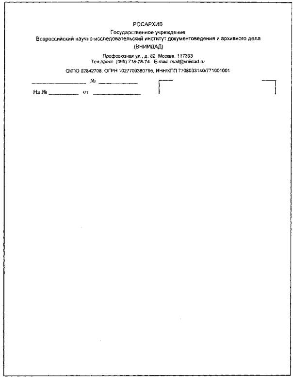 СИСТЕМА Требования к оформлению документов Unified systems of documentation. Unified system of managerial documentation. Requirements for presentation of documents Дата введения 2003-07-01 1 Область примененияНастоящий стандарт распространяется на организационно-распорядительные документы, относящиеся к Унифицированной системе организационно-распорядительной документации (УСОРД), - постановления, распоряжения, приказы, решения, протоколы, акты, письма и др. (далее - документы), включенные в ОК 011-93 «Общероссийский классификатор управленческой документации» (ОКУД) (класс 0200000). Настоящий стандарт устанавливает: состав реквизитов документов; требования к оформлению реквизитов документов; требования к бланкам документов, включая бланки документов с воспроизведением Государственного герба Российской Федерации. Схемы расположения реквизитов документов приведены в приложении А; образцы бланков документов - в приложении Б. Требования настоящего стандарта являются рекомендуемыми. 2 Состав реквизитов документовПри подготовке и оформлении документов используют следующие реквизиты: 01 - Государственный герб Российской Федерации; 02 - герб субъекта Российской Федерации; 03 - эмблема организации или товарный знак (знак обслуживания); 04 - код организации; 05 - основной государственный регистрационный номер (ОГРН) юридического лица; 06 - идентификационный номер налогоплательщика/код причины постановки на учет (ИНН/КПП); 07 - код формы документа; 08 - наименование организации; 09 - справочные данные об организации; 10 - наименование вида документа; 11 - дата документа; 12 - регистрационный номер документа; 13 - ссылка на регистрационный номер и дату документа; 14 - место составления или издания документа; 15 - адресат; 16 - гриф утверждения документа; 17 - резолюция; 18 - заголовок к тексту; 19 - отметка о контроле; 20 - текст документа; 21 - отметка о наличии приложения; 22 - подпись; 23 - гриф согласования документа; 24 - визы согласования документа; 25 - оттиск печати; 26 - отметка о заверении копии; 27 - отметка об исполнителе; 28 - отметка об исполнении документа и направлении его в дело; 29 - отметка о поступлении документа в организацию; 30 - идентификатор электронной копии документа. 3 Требования к оформлению реквизитов документов3.1 Государственный герб Российской Федерации помещают на бланках документов в соответствии с Федеральным конституционным законом «О Государственном гербе Российской Федерации» (Собрание законодательства Российской Федерации, 2000, № 52, часть I, ст. 5021). 3.2 Герб субъекта Российской Федерации помещают на бланках документов в соответствии с правовыми актами субъектов Российской Федерации. 3.3 Эмблему организации или товарный знак (знак обслуживания) помещают на бланках организаций в соответствии с уставом (положением об организации). 3.4 Код организации проставляют по Общероссийскому классификатору предприятий и организаций (ОКПО). 3.5 Основной государственный регистрационный номер (ОГРН) юридического лица проставляют в соответствии с документами, выдаваемыми налоговыми органами. 3.6 Идентификационный номер налогоплательщика/код причины постановки на учет (ИНН/КПП) проставляют в соответствии с документами, выдаваемыми налоговыми органами. 3.7 Код формы документа проставляют по Общероссийскому классификатору управленческой документации (ОКУД). 3.8 Наименование организации, являющейся автором документа, до