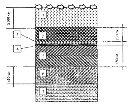 8. Рекультивация полигонов8.1. Рекультивация полигонов содержит комплекс природоохранных и инженерно-технических мероприятий, направленных на восстановление территорий, занятых под полигон с целью дальнейшего их использования. Работы по рекультивации полигонов составляют систему мероприятий, осуществляемых в период строительства, эксплуатации и закрытия полигона. 8.2. Направление рекультивации определяют дальнейшее целевое использование рекультивируемых территорий в народном хозяйстве. 8.3. Наиболее приемлемыми направлениями дальнейшего использования территорий служат сельскохозяйственное, лесохозяйственное, рекреационное и строительное применение. 8.4. Рекультивацию территории полигона проводит организация, эксплуатирующая полигон, на основании предварительного разрешения на проведение работ органов санитарно-эпидемиологического надзора и государственного комитета по охране окружающей среды Московской области с участием предприятия, выполняющего дальнейшее использование земель. 8.5. Рекультивация полигонов выполняется в два этапа: технического и биологического. 8.6. Технический этап заключается в разработке технологических и строительных мероприятий, решений и конструкций по устройству защитных экранов основания и поверхности полигона, сбору и утилизации биогаза, сбору и обработке фильтрата и поверхностных сточных вод. Биологический этап рекультивации предусматривает агротехнические и фитомелиоративные мероприятия, направленные на восстановление нарушенных земель. Биологический этап осуществляется вслед за инженерно-техническим этапом рекультивации. 9. Защитные экраны полигона9.1. Общие положения. 9.1.1. Защитные экраны основания и поверхности карт складирования отходов - это основные конструктивные элементы, обеспечивающие природоохранную функцию - защиту грунта, грунтовых и поверхностных вод от проникновения фильтрата, а также атмосферы от выделяющего газа, пыли, запахов, распространения болезнетворных микробов. Конструкции защитных экранов, расположенных на бортах котлованов и на откосах насыпей ТБО должны удовлетворять требованиям расчета геокомпозиционных систем по I предельному состоянию с коэффициентом запаса устойчивости Kst ³ 1,2. 9.1.2. Охрана грунта, грунтовых и поверхностных вод во время эксплуатации достигается благодаря сочетанию геологического барьера и основной системы гидроизоляции полигона. В период пассивной фазы, после закрытия полигона и вывода его из эксплуатации охрана грунта, грунтовых и поверхностных вод, воздушного пространства обеспечивается сочетанием системы верхней гидроизоляции (защитный экран поверхности полигона) с защитным экраном основания полигона. 9.1.3. Геологические барьеры. Геологическим барьером называется естественное грунтовое основание, расположенное ниже планировочной отметки карты, которое обладает свойствами и размерами, достаточными для препятствия распространения вредных веществ в грунтовой среде. Геологический барьер состоит из тонкодисперсных грунтов, обладающих низким коэффициентом фильтрации, менее 1×10-7 м/с, и низкой адсорбционной способностью по отношению к загрязнителям и токсикантам. Геологический барьер должен быть распространен за границы полигона на расстояние, обеспечивающее невозможность расположения (внешнего или п