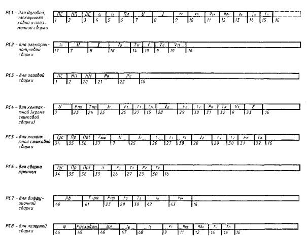 ПРИЛОЖЕНИЕ 1Обязательное ТРЕБОВАНИЯ К ЗАПОЛНЕНИЮ И ОФОРМЛЕНИЮ ТИПОВЫХ БЛОКОВ РЕЖИМОВ, ПРИМЕНЯЕМЫХ В ДОКУМЕНТАХ НА СВАРКУ И ПАЙКУ1. При описании операций сварки и пайки следует применять типовые блоки режимов, указанные соответственно на черт. 1 и 2. Другие блоки режимов допускается устанавливать на уровне отрасли или предприятия (организации). 2. Размеры граф, входящих в блоки режимов, устанавливает разработчик документов, исходя из: - максимальной длины строки - 286 мм (110 знаков) (минус размер графы для обозначения служебных символов и порядкового номера строки); - необходимости размещения граф таким образом, чтобы вертикальные линии, разделяющие графы строки со служебным символом К/М и графы блока режимов, по возможности совпадали; - требуемого количества знаков для записи параметров режимов с учетом единиц величины; - возможности дополнения информацией, отсутствующей в блоках режимов, приведенных на черт. 1 и 2. 3. При введении в формы документов блоков режимов в строке со служебным символом Р следует указывать сокращенное обозначение блока режимов по черт. 1 и 2, например РС3 - блок режимов газовой сварки, РП2 - блок режимов пайки в печи. На последующих строках форм документов следует указывать только служебный символ Р. 4. Графы блоков режимов сварки (РС1-PC8) следует заполнять в соответствии с табл. 3. Таблица 3