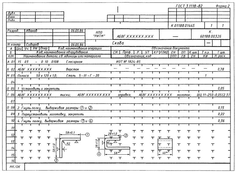 Примечания: 1. В графе «количество знаков» указано число знаков, соответствующее ширине данной графы. Максимальное количество знаков, вносимых в графу, на один знак меньше числа знаков, указанных в табл. 2. 2. Размеры граф даны исходя из шага печатающих устройств, равного 2,6 мм. 3. Для документов, заполняемых рукописным способом, размеры граф допускается округлять до ближайшего целого числа. 1.3.5. Обозначения единиц величин параметров технологических режимов следует указывать в заголовке графы (если позволяет место) или непосредственно при записи параметров. 2. ТРЕБОВАНИЯ К ОФОРМЛЕНИЮ ДОКУМЕНТОВ2.1. Общие требования к формам и бланкам документов при проектировании документов и общие требования к их оформлению: - по ГОСТ 3.1129 и ГОСТ 3.1130 - без применения средств механизации и автоматизации; - по ГОСТ 2.004 - с применением средств механизации и автоматизации. 2.2. При подготовке форм МК и форм 1, 1а ОК к размножению допускается предусматривать в формах документов зоны для внесения графических иллюстраций к процессам и операциям. Зоны следует располагать в нижней части форм документов. Размеры зон устанавливает разработчик документов исходя из кратности интервалу печатающих устройств. При использовании зон для внесения текстовой информации в формах документов следует применять линии, выполненные знаками «-» или «.», обозначающие границу строк и граф. Интервалы пунктирных линий устанавливает разработчик документов исходя из обеспечения четкости выполнения графических иллюстраций. Допускается не указывать пунктирные линии. Пример оформления МК/ОК для слесарных работ приведен в приложении 2. 2.3. Запись операций и переходов в документах следует выполнять: - по ГОСТ 3.1703 - для слесарных, слесарно-сборочных работ; - по ГОСТ 3.1704 - для пайки и лужения; - по ГОСТ 3.1705 - для сварки. Примечание Запись наименования операций для сборки, включая сопутствующие процессы и операции, выполняют по классификатору технологических операций (КТО), а запись содержания соответствующих операций и переходов - в соответствии с требованиями, установленными на уровне отрасли или предприятия (организации). 2.4. Общие требования к комплектности и оформлению комплектов документов: - по ГОСТ 3.1119 - для единичных технологических процессов; - по ГОСТ 3.1121 - для типовых (групповых) технологических процессов (операций). 2.5. Отражение и оформление общих требований безопасности труда в технологической документации - по ГОСТ 3.1120. 2.6. При применении форм МК, выполняющих функции документов других видов, их оформление следует выполнять в соответствии с правилами для документов применяемых видов, предусмотренными стандартами ЕСТД. При этом в графе 28 блока Б6 основной надписи по ГОСТ 3.1103 следует проставлять через дробь условное обозначение соответствующего вида документа, функции которого выполняет МК, например МК/КТП, МК/ОК и т.д. 2.7. При маршрутно-операционном описании выбор состава операций, подлежащих операционному и маршрутному описанию, устанавливает разработчик документов с учетом требований п. 1.3. 2.8. При описании операций запись информации следует выполнять в следующем порядке с привязкой к служебным символам: - А, Б, К/М, О, Т, Р - для форм МК с горизонтальным расположением поля подшивки; - В, Г, Д, Л/М, Н/М, О, Т, Р - для форм МК с вертикальным расположением поля подшивки; - К/М, О, Т, Р - для ф