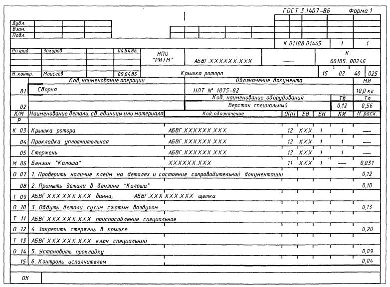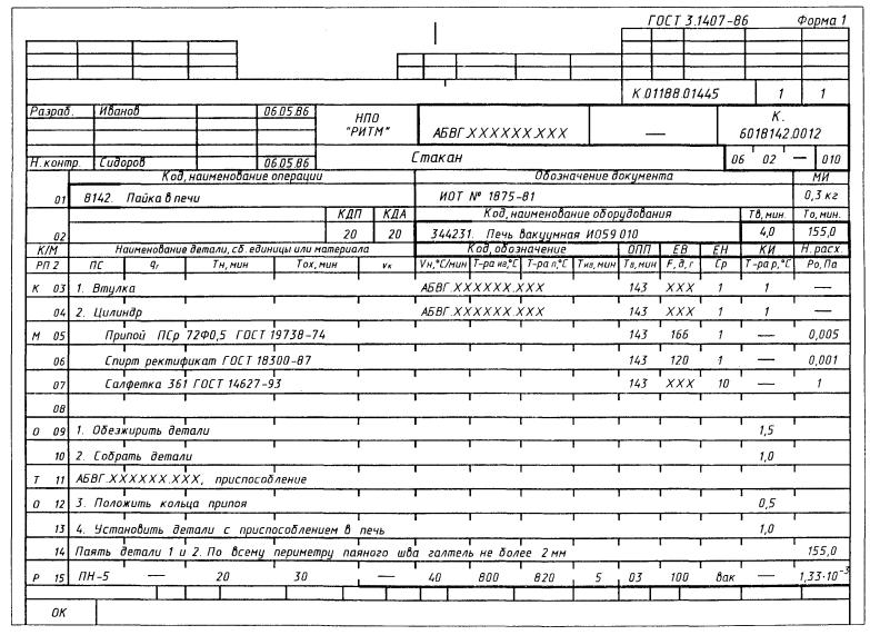 Черт. 1 Типовые блоки технологических режимов пайки Черт. 2 ПРИЛОЖЕНИЕ 2Рекомендуемое ПРИМЕРЫ ОФОРМЛЕНИЯ ДОКУМЕНТОВ, ВЫПОЛНЕННЫХ НА МК И ОКПример распечатки формы ОК на АЦПУ ЭВМ