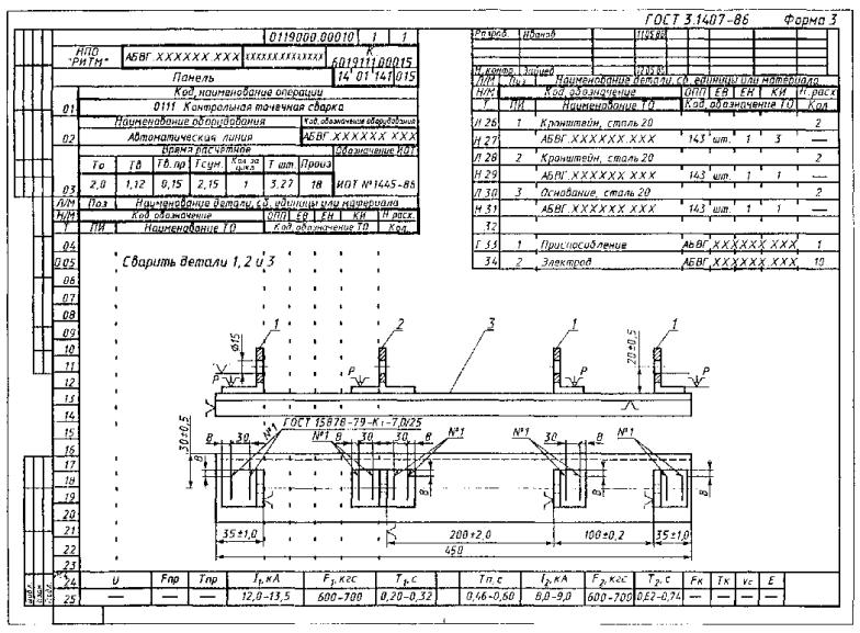 Дата введения 01.01.88 Настоящий стандарт устанавливает формы и требования к заполнению и оформлению технологических документов, проектируемых различными методами, на основные и сопутствующие процессы и операции, специализированные по методам сборки (включая сварку, пайку, клепку, монтаж, склеивание, обмотку и изолирование, а также промывку, пропитку, сушку, настройку, регулировку, выполнение слесарных и прочих операций) отдельно или комплексно применяемых при изготовлении изделий (составных частей изделий) машиностроения и приборостроения. 1. ФОРМЫ И ТРЕБОВАНИЯ К ЗАПОЛНЕНИЮ ДОКУМЕНТОВ1.1. В зависимости от типа и характера производства, стадии разработки технологической документации (далее - документации), степени детализации описания и применяемых методов сборки, выбор документов соответствующих видов устанавливает разработчик документов по табл. 1. 1.2. Требования к построению и заполнению операционных карт (ОК), устанавливаемых настоящим стандартом (формы 1 и 1а, 2 и 2а, 3 и 3а), - по табл. 2. 1.3. При описании технологического процесса сварки и пайки, независимо от типа и характера производства, документы на основные операции должны предусматривать операционное описание с обязательным указанием технологических режимов. 1.3.1. Параметры технологических режимов, в зависимости от вида (способа) сварки и пайки, следует указывать в последовательности, предусмотренной в типовых блоках режимов. Типовые блоки режимов приведены в приложении 1. 1.3.2. Выбор соответствующего блока режимов и простановку параметров режимов осуществляет разработчик документов. 1.3.3 Типовые блоки режимов могут быть внесены в бланки документов после строки со служебным символом К/М с привязкой к служебному символу Р. В этом случае формы документов будут иметь специальное назначение и распространяться только на сварку или пайку конкретных видов (способов). Обозначение таких форм документов следует выполнять в соответствии с требованиями, изложенными в приложении 1. Примечания: 1. Наиболее удобными формами документов для внесения типовых блоков технологических режимов в головку таблицы являются формы 2 и 1б МК по ГОСТ 3.1118 и ОК, формы 1 и 1а настоящего стандарта. 2. При наличии большого количества параметров режимов допускается размещать часть информации в строке со служебным символом О после текста содержания перехода. 1.3.4. При использовании сварки или пайки различных видов (способов) в одном технологическом процессе, а также для документов формата А4 с вертикальным расположением поля подшивки следует применять построчную запись информации по технологическим режимам с привязкой к служебному символу Р. В этом случае информацию следует записывать после записи содержания операции (перехода) и данных по технологической оснастке с указанием наименований или условных обозначений параметров режимов и единиц величины. Отсутствующие в блоке режимов параметры допускается записывать таким же образом. Запись информации следует выполнять по всей длине строки с возможностью переноса информации на последующие строки. Таблица 1
