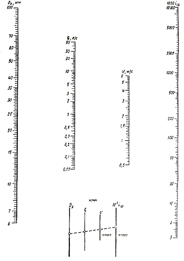 ν - коэффициент кинематической вязкости жидкости, м2/с; Кэ - коэффициент эквивалентной равномернозернистой шероховатости полипропиленовых труб; Кэ = 0,00002 м. Примечание: При в > 2 следует принимать в = 2. 2.2.4. Для приближенных расчетов допускается пользоваться номограммами (рис. 2.2.1, 2.2.2), построенными под руководством проф. Г.С. Хованского; для более точных расчетов - таблицами прил. 3. Номограмма (рис. 2.2.1) и таблицы рассчитаны при Кэ = 0,00002 м, температуре воды +10 °С (ν = 1,31·10-6 м2/с) и внутреннем диаметре труб, равном наружному диаметру минус две толщины стенки. Номограмма (рис. 2.2.2) дает возможность определить коэффициент пересчета потерь напора, определенных для воды с t = +10 °С, на другую температуру. Номограмма (рис. 2.2.1) построена для случая, когда расчетный диаметр Dp изменяется непрерывно. Она состоит из параллельных логарифмических шкал Dp, q, v и 1000i10, где i10 = hдл/l - удельная потеря на трение при транспортировке воды с температурой 10 °С, hдл - потери напора на трение в трубопроводе длиной 1. Номограмма на рис. 2.2.1 предназначена для случая, когда 6 ≤ Dp ≤ 100 мм. Нахождение v и 1000i10 производится одним наложением линейки: прикладываем край линейки к заданным точкам шкал Dp и q и в точках пересечения края линейки со шкалами v и 1000i10 читаем ответы. Для определения поправочного коэффициента Кt к 1000i10 при транспортировке воды с температурой, отличной от 10 °С, служит циркульная номограмма (рис. 2.2.2) для случая, когда 6 ≤ Dp ≤ 100 мм. Способ пользования этой номограммой следующий. Значение Кt находится по заданным значениям величин v, Dp и t путем откладывания циркулем или измерителем отрезка, равного данному (см. ключи пользования на номограмме). Номограмма состоит из бинарных полей (v, Dp и t) с общим семейством параллельных прямых v и расположенной на прямой Кt фиксированной точкой, отмеченной стрелкой, и ответной шкалы Кt. Пример. Определить значения v и i в трубе из полипропилена с расчетным диаметром Dp = 20 мм при q = 0,7 л/с и t = 45 °С. По номограмме (рис. 2.2.1) одним наложением линейки находим, что значениям Dp = 20 мм при q = 0,7 л/с отвечают значения v = 2,25 м/с и 1000it = 350, т.е. i = 0,35. Обращаемся к номограмме на рис. 2.2.2. Помещаем одну ножку циркуля в точку пересечения линии Dp с пометкой Dp = 20 мм и прямой v с пометкой v = 2,25 м/с, а другую - в точку пересечения линии t с пометкой t = 45 °С и прямой v с пометкой v = 2,25 м/с. Не меняя раствора циркуля, одну его ножку помещаем в фиксированную точку, а другую - на шкалу Кt, где читаем ответ: Кt = 0,88. Вычисляем it по формуле it = Кti10 = 0,88·0,35 = 0,308. Итак, v = 2,25 м/с, it = 0,308. 2.2.5. Потери напора в местных сопротивлениях определяются по формуле: