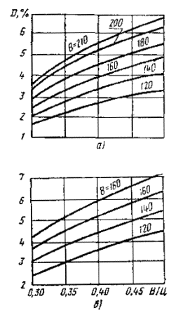 Примечание. Снижение водопотребности показано для случая введения добавки в количестве 0,6 кг на 1 м3 бетона в пересчете на сухое вещество. д) определяют уточненные расход воды и водоцементное отношение: