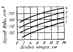 величины); a - коэффициент раздвижки зерен щебня раствором; Коэффициент раздвижки зерен крупного заполнителя раствором устанавливают по табл. 4 в зависимости от расхода цементного теста на 1 м3. Рис. 1. Водопотребность бетонной смеси, изготовленной с применением портландцемента, песка средней крупности и гравия с наибольшей крупностью: 1 - 80; 2 - 40; 3 - 20; 4 - 10 мм Таблица 4