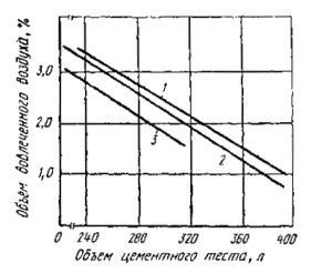 где П, Ц, В, Щ - соответственно расходы песка, цемента, воды, и щебня на 1 м3 бетона, кг; gц, gп, gщ - соответственно удельные массы цемента, песка и щебня, кг/л. Рис. 2. Количество вовлеченного воздуха в бетонной смеси с добавкой силиконата натрия в зависимости от объема цементного теста с наибольшей крупности щебня: 1 - 10; 2 - 20; 3 - 40 мм В случае, если расчетный состав не обеспечивает заданной подвижности, в замес следует добавлять цемент и воду (при содержании в воде добавки из расчета 0,6 кг на 1 м3 в пересчете на сухое вещество) при сохранении В/Ц. Добавление цемента и воды с добавкой продолжают до тех пор, пока не будет достигнута заданная подвижность. Если в первом замесе подвижность бетонной смеси превысит заданную, то в приготовленный замес следует добавить 5-10 % песка и щебня. 27. Перед изготовлением образцов для испытаний на прочность и для проверки на морозостойкость следует уточнить состав бетона с учетом п. 26, для чего следует определить фактический объем пробного замеса бетонной смеси, уплотненного способом, принятым в производственных условиях. Объем уплотненной бетонной смеси определяют по формуле