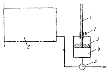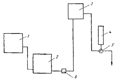 17. При применении порошков ГКП-11 или ГКП-10 их водные растворы готовят на производстве. Для растворения используют воду, нагретую до 40-50 °С. Раствор фильтруют через сетчатый фильтр с отверстиями 0,5 мм. Концентрацию растворов определяют в соответствии с табл. 2 по их плотности. Приложение 11Рекомендуемое УСТАНОВКА ДЛЯ ПРИГОТОВЛЕНИЯ ВОДНЫХ РАСТВОРОВ ДОБАВОК И ИХ ДОЗИРОВАНИЯ В БЕТОННУЮ СМЕСЬ1. Принципиальная схема установки для приготовления и дозирования одной добавки показана на рис. 1. Рис. 1. Схема установки для приготовления и дозирования растворов добавок: 1 - приготовительный бак; 2 - бак рабочего раствора; 3 - расходный бак; 4 - дозатор; 5 - кран; 6 - насос Приготовление раствора добавки производится в приготовительном баке. Сюда подается вода, осуществляется ее подогрев и после загрузки концентрата производится перемешивание (механическим способом или с помощью сжатого воздуха) до полного его растворения. Из приготовительного бака раствор через фильтры поступает в бак рабочего раствора, где регулируется и устанавливается рабочая концентрация раствора. Эти баки и следует регулярно промывать водой. Для этой цели они должны иметь отводы в канализацию. Готовый раствор добавки с помощью насоса подается в расходный бак. Из него раствор самотеком поступает в дозатор и затем с помощью крана сливается в воду затворения. 2. Объемы трех баков подбираются в зависимости от производительности бетоносмесительного узла из расчета обеспечения его раствором добавки на 1-3 смены работы. 3. Все баки должны иметь изнутри антикоррозийное покрытие. Для этой цели может быть использована перхлорвиниловая эмаль любой марки. 4. Рекомендуется использовать бронзовые вентили и краны тех же марок, что и для воды. 5. Наиболее важным узлом установки является дозирующее устройство вместе с системой управления. От конструкции этого узла зависит точность дозирования и надежность работы установки. Рекомендуется использовать дозаторы емкостью 3-5 литров (для добавок СНВ, СПД, 136-41) и емкостью 10-12 литров (для добавки ЛСТ). Рис. 2. Схема дозатора ПКБ ЦНИИС: 1 - трубка; 2 - устройство для фиксации поршня; 3 - поршень; 4 - корпус; 5 - двухходовой кран; 6 - расходный бак 6. При производстве бетонных работ в полигонных условиях следует использовать дозаторы простейшей конструкции с редко изменяемой дозой. Схема такого дозатора показана на рис. 2. Объем дозы задается с помощью передвижного поршня, который фиксируется в заданном положении с помощью специального устройства. Набор дозы и ее слив в воду затворения производится с помощью двухходового крана. После набора дозы уровни жидкости в расходном баке и вертикальной трубе дозатора одинаковы (сообщающиеся сосуды). Длина трубки подбирается так, чтобы ее верхний конец был не ниже максимального уровня раствора в расходном баке. Дозатор можно использовать с дистанционным управлением, при этом двухходовой кран оборудуется пневмоприводом. 7. На заводах ЖБК следует использовать многопозиционные автоматические дозаторы, позволяющие отмерять заданную дозу с пульта оператора. Многопозиционный дозатор оборудуется набором датчиков, например, электродов или герконов (6-10 шт.), фиксирующих уровень раствора в дозаторе. Положение датчиков можно изменять вручную. При дозировании выполняются следующие операции: а) оператор с помощью многоконт