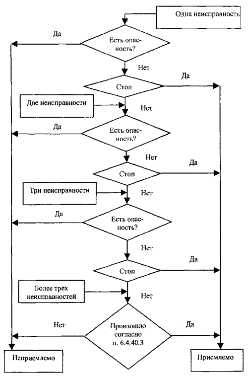 Рис. 6. Блок-схема оценки электрических схем безопасности 6.5.2. Присоединительные зажимы электрических машин, аппаратов и клеммных наборов должны соответствовать типу и сечению применяемого провода (кабеля). Если после размыкания одного или нескольких главных выключателей некоторые клеммы остаются под напряжением, то они должны быть отделены от клемм, не находящихся под напряжением, а при напряжении на них более 50 В они должны быть промаркированы. 6.5.3. Электрическое оборудование лифта должно быть снабжено необходимыми символами и/или обозначениями, облегчающими его наладку и обслуживание в соответствии со стандартами. Контакторы, реле, плавкие предохранители и клеммные наборы цепей, идущих к панелям управления, должны быть промаркированы в соответствии с электрической схемой. Необходимые данные предохранителя, такие как его номинал и тип, должны быть указаны или на самом предохранителе, или на его патроне. Провода, подходящие к зажимам клеммных наборов, а также к зажимам электрооборудования, должны иметь маркировку. Допускается осуществлять маркировку проводов цветом. 6.5.4. Для защиты от механических повреждений защитная оболочка кабелей и проводов должна полностью заходить в корпус выключателей или других устройств или же должна заканчиваться соответствующим уплотнением. Закрытые каркасы дверей кабины и шахты лифта могут рассматриваться в качестве кожухов электрических устройств; однако, при наличии опасности механического повреждения вследствие перемещения деталей или острых кромок самого каркаса, провода, подключаемые к устройствам безопасности, должны иметь механическую защиту. 6.5.5. Конструкция и размещение электрических разъемов и других съемных электрических устройств, устанавливаемых в электрические цепи безопасности, должны исключать возможность их неправильной установки, если неправильное подключение таких устройств может привести к опасным сбоям в работе лифта или если их удаление производится без помощи инструмента. 6.6. Освещение и розетки питания6.6.1. Питание электрического освещения кабины, шахты и пространства для размещения оборудования лифта, а также розеток для подключения инструмента может быть осуществлено от осветительной сети здания (сооружения). 6.6.2. Освещение кабины может быть включено (отключено) автоматически и (или) выключателем ручного действия. В лифте, оборудованном устройством контроля загрузки кабины, допускается при отсутствии пассажиров в кабине и при закрытых дверях, автоматическое отключение освещения кабины. В лифте, не имеющем устройства контроля загрузки кабины, допускается автоматическое отключение рабочего освещения при нахождении в кабине людей, если по истечении 5 с после закрытия дверей кабины не началось ее движение. 6.6.3. Выключатели ручного действия освещения кабины и питания розетки на крыше кабины, если они необходимы, должны быть установлены в машинном помещении, а при его отсутствии - в запираемом шкафу по п. 4.4.11. В машинном помещении, общем для нескольких лифтов, на каждую кабину должен быть свой выключатель, расположенный поблизости от устройства по п. 6.1.2. 6.6.4. При установке розеток для переносных ламп в помещении для размещения оборудования, на крыше кабины, в приямке или под кабиной напряжение их питания должно быть не более 42 В. Крайние аппараты ос