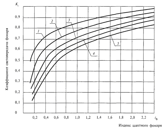 где Аф.в - площадь входного верхнего отверстия фонаря; Nф - число фонарей; q(ai) - коэффициент, учитывающий неравномерную яркость облачного неба МКО и определяемый по рисунку 11; a - угол между прямой, соединяющей расчетную точку с центром нижнего отверстия фонаря, и нормалью к этому отверстию; eср - среднее значение геометрического КЕО; Кс - коэффициент светопередачи фонаря, определяемый для фонарей с диффузным отражением стенок по рисунку 12, а для фонарей с направленным отражением стенок - по рисунку 13 по значению индекса светового проема шахтного фонаря iф; Рисунок 11 - График для определения коэффициента q(a) в зависимости от угла a 1 - rд = 0,9; 2 - rд = 0,8; 3 - rд = 0,7; 4 - rд = 0,6; 5 - rд = 0,5 Рисунок 12 - График для определения коэффициента светопередачи Кс фонарей с диффузным отражением стенок шахты 1 - rн = 0,9; 2 - rн = 0,8; 3 - rн = 0,7; 4 - rн = 0,6; 5 - rн = 0,5 Рисунок 13 - График для определения коэффициента светопередачи Кс фонарей с направленным отражением стенок шахты при различных значениях коэффициента диффузного отражения стенок шахты Кз - расчетный коэффициент, учитывающий снижение КЕО и освещенности в процессе эксплуатации вследствие загрязнения и старения светопрозрачных заполнений в световых проемах, а также снижение отражающих свойств поверхностей помещения (коэффициент запаса). Индекс светового проема фонаря с отверстиями в форме прямоугольника iф определяют по формуле