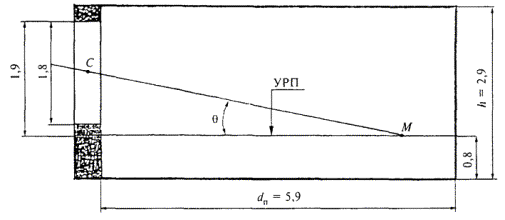 Рисунок 20 - Разрез и план рабочего кабинета Решение 1 Учитывая, что глубина помещения dп свыше 5 м (см. 8.8), по таблице 6 находят, что нормированное значение КЕО равно 0,6 %. 2 Производят предварительный расчет естественного освещения по исходной глубине помещения dп = 5,9 м и высоте верхней грани светового проема над условной рабочей поверхностью h01 = 1,9 м; определяют, что dп/h01 = 3,1. 3 На рисунке 2 на соответствующей кривой е = 0,6 % находят точку с абсциссой dп/h01 = 3,1. По ординате этой точки определяют, что необходимая относительная площадь светового проема Ао/Ап = 21,5 %. 4 Определяют площадь светового проема А0 по формуле 0,215Ап = 0,215 × 17,7 = 3,81 м2. Следовательно, ширина светового проема b0 = 3,81/1,8 = 2,12 м. Принимают оконный блок размером 1,8 ´ 2,1 м. 5 Производят проверочный расчет КЕО в точке М (рисунок 20) в соответствии с приложением Б по формуле eбр = eбqir0t0/Kз. Учитывая, что противостоящих зданий нет, eЗД × КЗД = 0. 6 Накладывают график I для расчета КЕО методом А.М. Данилюка на поперечный разрез помещения (рисунок 21), совмещая полюс графика I - 0 с точкой М, а нижнюю линию - с условной рабочей поверхностью; подсчитывают число лучей по графику I, проходящих через поперечный разрез светового проема: n1 = 2,96. 7 Отмечают, что через точку С на разрезе помещения (рисунок 21) проходит концентрическая полуокружность 26 графика I. 8 Накладывают график II для расчета КЕО на план помещения (рисунок 20) таким образом, чтобы его вертикальная ось и горизонталь 26 проходили через точку С; подсчитывают по графику II число лучей, проходящих от неба через световой проем: n2 = 24. 9 Определяют значение геометрического КЕО по формуле eб = 0,01n1n2 = 0,01 × 2,96 × 24 = 0,71. Разрез План