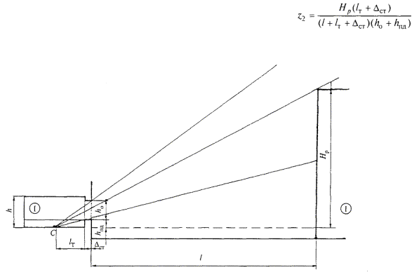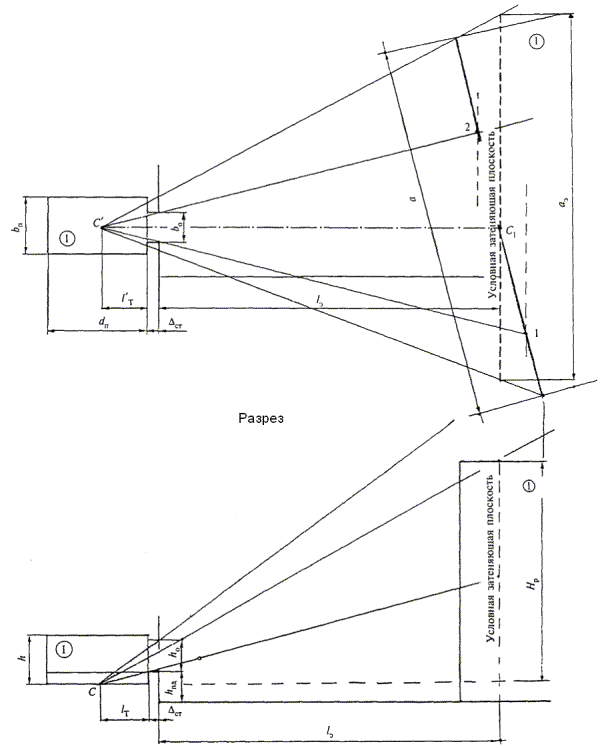 где l1 и l2 - расстояния от исследуемого помещения до части длины здания а1 и до части длины здания а2. 2 Строят лучи С¢-1 и С¢-2, соединяющие расчетную точку в плане с крайними точками горизонтальной проекции плоскости фасада экранирующего здания. 3 Определяют длину условной затеняющей плоскости aэ, равную отрезку 1¢-2¢. 4 Вычисляют параметры застройки для схемы № 4 применительно к условной затеняющей плоскости длиной аэ и расстоянием lэ и суммарной шириной окон, включая простенки bс.п, по формулам (Б.12) и (Б.13). Схема № 5 Экранирующее здание со сложной конфигурацией по высоте (рисунок Б.7) 1 Вычисляют параметры застройки по формулам:
