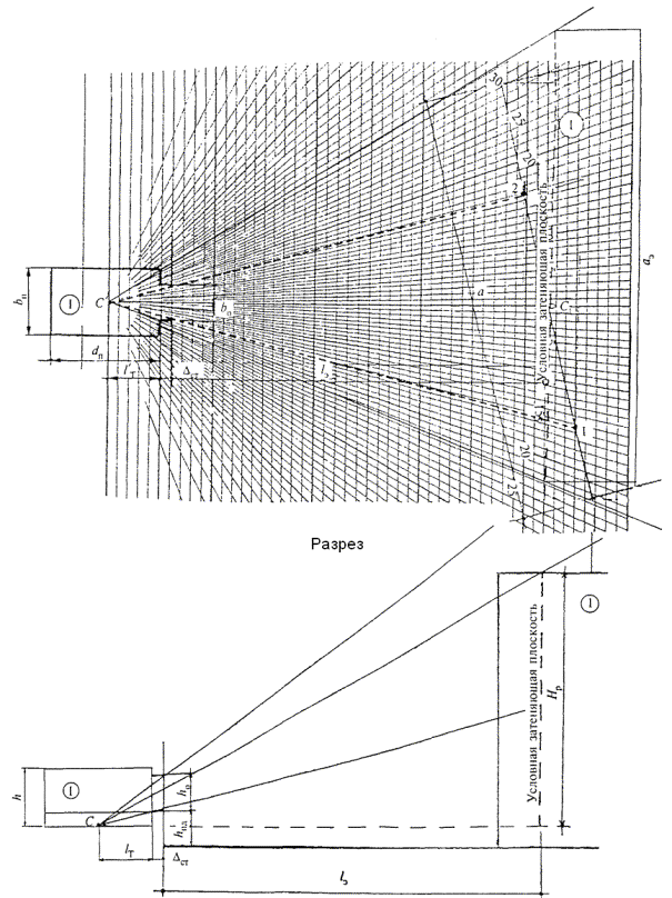 А - расчетная точка; 0 - полюс графика I; С1 - середина участка светового проема, через который из расчетной точки видно небо; С2 - середина участка светового проема, через который из расчетной точки видно противостоящее здание Рисунок 9 - Пример использования графика I для подсчета числа лучей от неба и противостоящего здания ПРОВЕРОЧНЫЙ РАСЧЕТ КЕО ПРИ ВЕРХНЕМ ОСВЕЩЕНИИ7.8 Проверочный расчет КЕО в точках характерного разреза помещения при верхнем освещении через фонари прямоугольные, шед и трапециевидные следует выполнять в соответствии с приложением Б настоящего Свода правил по формуле (Б.2). Расчет КЕО производят в следующей последовательности: а) график I (рисунок 8) накладывают на поперечный разрез помещения таким образом, чтобы полюс (центр) 0 графика совмещался с расчетной точкой, а нижняя линия графика - со следом рабочей поверхности. Подсчитывают число радиально направленных лучей графика I, проходящих через поперечный разрез первого проема (n1)1, второго проема - (n1)2, третьего проема - (n1)3 и т.д.; при этом отмечают номера полуокружностей, которые проходят через середину первого, второго, третьего проемов и т.д.; б) определяют углы q1, q2, q3 и т.д. между нижней линией графика I и линией, соединяющей полюс (центр) графика I с серединой первого, второго, третьего проемов и т.д.; в) график II (рисунок 10) накладывают на продольный разрез помещения; при этом график располагают так, чтобы его вертикальная ось и горизонталь, номер которой должен соответствовать номеру полуокружности на графике I, проходили через середину проема (точка С). Подсчитывают число лучей по графику II, проходящих через продольный разрез первого проема (n2)1, второго проема - (n2)2, третьего проема - (n2)3 и т.д.; г) вычисляют значение геометрического КЕО eв1 в первой точке характерного разреза помещения по формуле eВ1 = 0,01[(n1qn2)1 + (n1qn2)2 + (n1qn2)3 + ... + (п1qп2)Р], (3) где Р - число световых проемов; q - коэффициент, учитывающий неравномерную яркость участка небосвода, видимого из первой точки соответственно под углами q1, q2, q3 и т.д.; д) повторяют вычисления в соответствии с пунктами «а», «б», «в», «г» для всех точек характерного разреза помещения до N включительно (где N - число точек, в которых производят расчет КЕО); е) определяют среднее значение геометрического КЕО eср по формуле (Б.7) приложения Б; ж) по заданным параметрам помещения и световых проемов в соответствии с приложением Б определяют значения r2, kф, t0; з) последовательно для всех точек вычисляют расчетное значение КЕО по формуле (Б.2) приложения Б. 7.9 Проверочный расчет значений КЕО в точках характерного разреза помещения при верхнем освещении евр от зенитных и шахтных фонарей следует выполнять по формуле