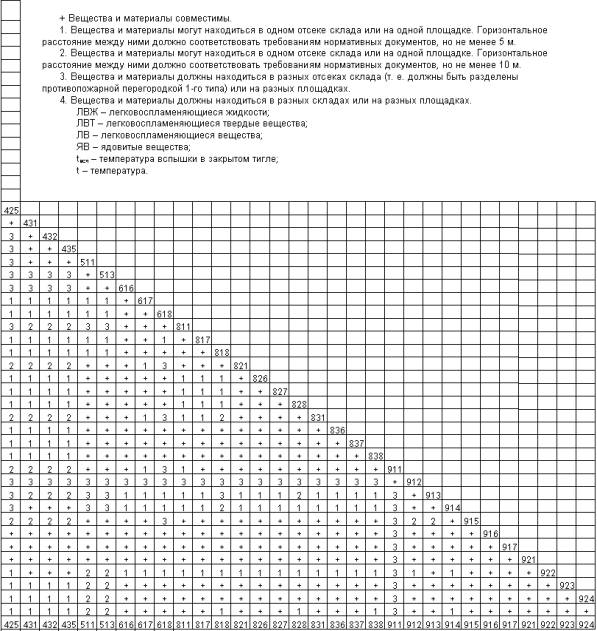 * - Код экстренных мер состоит из цифр, обозначающих необходимые действия при тушении пожара (аварии), и букв, обозначающих необходимые меры защиты людей: 1 - Воду и пену не применять. Применять сухие огнетушащие средства; 2 - Применять водяные струи; 3 - Применять распыленную воду; 4 - Применять пену или составы на основе хладонов; 5 - Предотвратить попадание веществ в сточные воды; 6 - Пену не применять; 7 - Порошки общего назначения не применять; 8 - Хладоны, углекислоту не применять; Д - Необходим дыхательный аппарат и защитные перчатки; П - Необходим дыхательный аппарат и перчатки только при пожаре; К - Необходим полный защитный комплект одежды и дыхательный аппарат; Э - Необходима эвакуация людей из близко расположенных помещений и зданий. Распределение особо опасных веществ и материалов при хранении