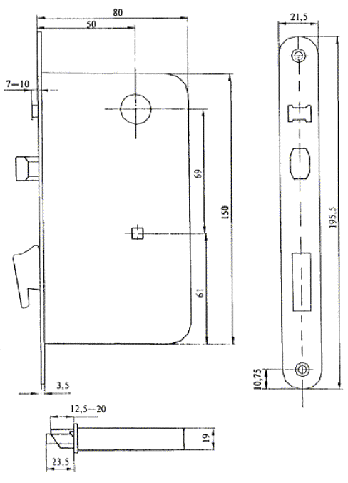 Рисунок В.12 - Пример замка врезного цилиндрового типа ЗВ7 с защелкой и крюкообразным засовом для дверных блоков из поливинилхлоридных или алюминиевых деталей