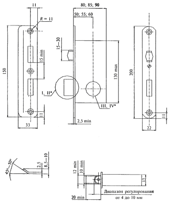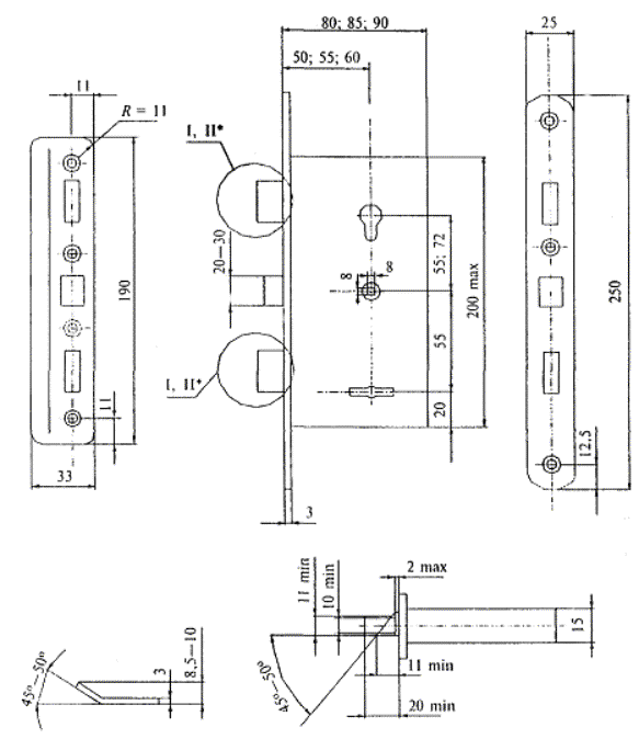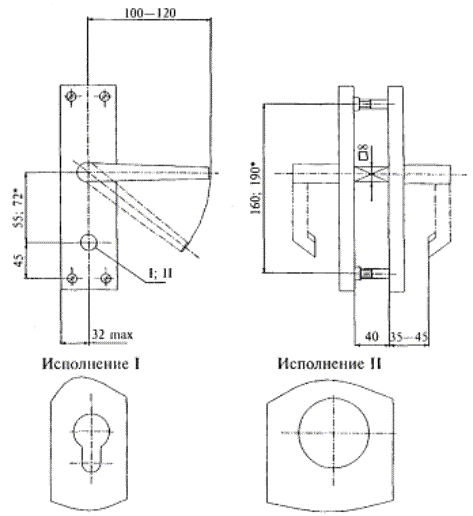 Рисунок B.11 - Пример замка врезного цилиндрового типа ЗВ4 для дверных блоков из поливинилхлоридных или алюминиевых профильных деталей