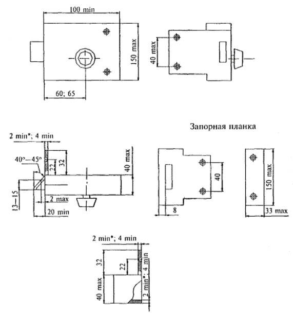 Дата введения 2004-03-01 1 Область примененияНастоящий стандарт распространяется на врезные и накладные замки с различными механизмами секретности, цилиндровые механизмы и защелки (далее - изделия) для дверей из различных материалов, применяемых в жилых, общественных и производственных зданиях. Требования к качеству замков, цилиндровых механизмов, обеспечивающих безопасность граждан и их имущества, изложены в разделах 4 и 5 и являются обязательными. Стандарт может быть применен для целей сертификации. 2 Нормативные ссылкиВ настоящем стандарте использованы ссылки на следующие стандарты: ГОСТ 9.303-84 ЕСЗКС. Покрытия металлические и неметаллические неорганические. Общие требования к выбору ГОСТ 538-2001 Изделия замочные и скобяные. Общие технические условия ГОСТ 1145-80 Шурупы с потайной головкой. Конструкция и размеры ГОСТ 1146-80 Шурупы с полупотайной головкой. Конструкция и размеры ГОСТ 4784-97 Алюминий и сплавы алюминиевые деформируемые. Марки ГОСТ 5221-77 Проволока из оловянно-цинковой бронзы. Технические условия ГОСТ 5222-72 Проволока из кремнемарганцевой бронзы. Технические условия ГОСТ 17474-80 Винты с полупотайной головкой классов точности А и В. Конструкция и размеры ГОСТ 17475-80 Винты с потайной головкой классов точности А и В. Конструкция и размеры ГОСТ 18143-72 Проволока из высоколегированной коррозионно-стойкой и жаростойкой стали. Технические условия ГОСТ 19091-2000 Замки и защелки. Методы испытаний ГОСТ 19424-97 Сплавы цинковые литейные в чушках. Технические условия ГОСТ 25140-93 Сплавы цинковые литейные. Марки 3 Термины и определенияТермины с соответствующими определениями, применяемые в настоящем стандарте, приведены в ГОСТ 538 и в приложении А настоящего стандарта. 4 Классификация, классы, типы и условные обозначения4.1. Классификация замков Замки классифицируют по следующим признакам: по способу установки на дверной блок: врезные; накладные; по применяемому механизму секретности: цилиндровые; сувальдные; кодовые; магнитные; по варианту открывания дверного блока: правые; левые; универсальные (в том числе переналаживаемые); по количеству применяемых механизмов секретности в замке: с одним и более однотипными механизмами секретности; с различными механизмами секретности (комбинированные); по конструктивному исполнению засова: прямоугольного сечения; из нескольких прутков круглого, прямоугольного и т.п. сечения; скошенный; крюкообразный; по способу вывода засова из корпуса замка: с использованием ключа, карточки, чипа и т.д.; с механизмом автоматического вывода. 4.2. Классификация защелок Защелки классифицируют по следующим признакам: по способу установки на дверной блок: врезные; накладные; по варианту открывания дверного блока: правые; левые; универсальные; по варианту конструктивного исполнения: с механизмом фиксирования; с механизмом фиксирования и механизмом дополнительного запирания; по виду исполнения механизма фиксирования: со скошенным засовом; с шариком; с роликом. 4.3. Классификация цилиндровых механизмов 4.3.1 Цилиндровые механизмы классифицируют по следующим признакам: по применению в замках: врезных; накладных; по варианту конструктивного исполнения цилиндрового механизма: односторонний; двусторонний; односторонний с механизмом постоянного ключа; по виду элементов секретности: штифтовые; пластинчатые; дисковые; магнитные; кодовые