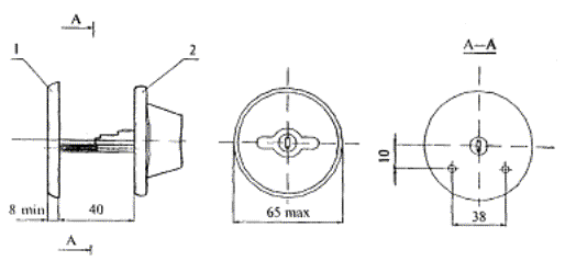 5.6.2 Механизм секретности замков 3-го и 4-го классов должен иметь защиту от высверливания и открывания отмычками (например, термообработанные дополнительные штифты, пластины, диски). 5.6.3 Сувальдные замки 3-го и 4-го классов должны иметь защиту от высверливания стойки хвостовика засова (например, термообработанные пластины, устанавливаемые на корпус замка перед стойкой хвостовика засова, или термообработанные элементы, вмонтированные в стойку хвостовика). 5.6.4 Замки 3-го и 4-го классов должны иметь защиту от перепиливания засова (например, термообработанная головка засова или вставленные в нее термообработанные элементы). 5.6.5 Накладки под ручки для врезных замков 3-го и 4-го классов должны закрепляться винтами. 5.6.6 Замки должны иметь вылет засова, мм, не менее: для деревянных дверей................................................................20; для стальных дверей....................................................................23; для дверных блоков из поливинилхлоридных или алюминиевых профильных деталей....................................12. 5.6.7 Цилиндровый механизм не должен выступать над поверхностью защитно-декоративной планки или накладки более чем на 3 мм. 5.7. Конструктивные требования 5.7.1 Корпуса замков и защелок должны иметь съемные крышки. Номинальная толщина стенок стальных корпусов и крышек врезных замков 3-го и 4-го классов должна быть не менее 1,5 мм. 5.7.2 Накладные замки должны иметь механизмы для фиксирования защелки в введенном в корпус положении. 5.7.3 Суммарные размеры штифтов цилиндра и корпуса, пружины в полностью сжатом состоянии и заглушки должны превышать длину отверстия в корпусе не менее чем на 2 мм и не менее чем в двух отверстиях в корпусе цилиндрового механизма. 5.7.4 В цилиндровых механизмах могут использоваться различные элементы, обеспечивающие секретность (штифты, пластины, диски, шарики, магниты и др.). Элементы секретности могут располагаться в один и более рядов. Для обеспечения охранных свойств механизм одного цилиндра должен иметь: комплектов штифтов - не менее 5; » пластин - » » 6; » дисков - » » 7. Крепление цилиндровых механизмов может осуществляться с помощью винтов, скоб, накладок и др. 5.7.5 Штифты цилиндра и корпуса цилиндрового механизма должны иметь фаску или сферу в соответствии с рисунком 1. 1 - штифт цилиндра; 2 - штифт корпуса Рисунок 1 - Примеры фасок и сфер штифтов цилиндра и корпуса цилиндрового механизма 5.7.6 Цилиндры всех типов штифтовых цилиндровых механизмов должны иметь буртик, а цилиндры пластинчатых и дисковых цилиндровых механизмов - буртик и стальную закаленную шайбу, диск. Штифты корпуса цилиндрового механизма замков 2 - 4-го классов должны иметь центральную проточку, указанную на рисунке 1. Число штифтов с проточкой должно быть на два меньше числа штифтов, взаимодействующих с одной рабочей гранью ключа. 5.7.7 Степень точности соединения корпуса цилиндрового механизма с цилиндром должна быть для замков класса: 1 - до 12-го квалитета включ.; 2 и 3 - » 9-го » »; 4 - » 7-го » ». 5.7.8 Отверстия для штифтов в корпусе цилиндрового механизма должны иметь индивидуальные заглушки. Допускается применение общей заглушки при наличии ее защиты от вскрытия. 5.7.9 Сувальдный механизм секретности состоит из сувальд (пластин) с пружинами, при этом количество сувальд должно быть не менее 4. Применение обшей пружины для сувальд не допускается. Для повышения охранных свойств сувальдных замков ре