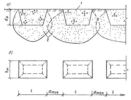3.20. Уплотнение оснований зданий и сооружений предварительным замачиванием, а также замачиванием и глубинными взрывами применяется с целью повышения прочности и несущей способности, устранения просадочных свойств грунтов, снижения их деформативности и коэффициента фильтрации. 3.21. Уплотнение просадочных грунтов предварительным замачиванием, а также замачиванием и глубинными взрывами основывается на способности их самоуплотнения при замачивании под действием собственного веса на площадках со II типом грунтовых условий. Глубинными взрывами вызывается дополнительная просадка замоченного лессовидного грунта с полным нарушением его первоначальной структуры. 3.22. Для устранения просадочных свойств всей толщи, начиная с отметки заложения фундаментов, методы глубинного уплотнения грунтовыми сваями, предварительным замачиванием, а также замачиванием и глубинными взрывами применяют с доуплотнением верхнего разрыхленного (буферного) слоя грунта тяжелыми трамбовками, устройством грунтовых подушек и т.п. 3.23. Уплотнение грунтов предварительным замачиванием грунта, а также замачиванием и глубинными взрывами наиболее целесообразно применять в тех случаях, когда просадочные грунты представлены лёссовидными суглинками и супесями, пылеватыми песками с относительно высоким коэффициентом фильтрации (не менее 0,2 м/сут) и с низким значением плотности сухого грунта ρs ≤ 1,45 т/м3 и нет ограничений по условиям существующей застройки. 3.24. Чтобы устранить влияние замачивания и глубинных взрывов на расположенные вблизи здания и сооружения, возведенные без ликвидации просадочных свойств или без полной их прорезки глубокими фундаментами, расстояние от замачиваемой площади до существующих зданий и сооружений должно составлять не менее трехкратной величины толщины просадочного грунта, а при использовании взрывов и расчетной сейсмобезопасной зоны. Примечания: 1. Если существующие здания или сооружения возведены с устранением просадочных свойств грунтов на всю толщу или с полной их прорезкой фундаментами, расстояния уменьшаются вдвое. 2. Если здания и сооружения расположены на расстояниях меньше вышеуказанных, уплотнение выполняется после устройства противофильтрационных завес. 3.25. Применение способов уплотнения грунтов предварительным замачиванием и замачиванием с использованием глубинных взрывов на оползневых склонах не допускается. 3.26. Взрывные работы производятся специализированными организациями «Союзвзрывпрома» и другими при строгом соблюдении техники безопасности и действующих Единых правил безопасности при взрывных работах. 3.27. В процессе проведения предварительного замачивания грунта и замачивания с глубинными взрывами систематически наблюдают за просадкой грунта по поверхностным и глубинным маркам путем их нивелирования относительно неподвижного репера или системы временных реперов, расположенных вне зоны развития просадки на расстоянии не менее двойной толщины слоя просадочного грунта. 3.28. Глубинное уплотнение водонасыщенных песчаных оснований применяется для повышения их несущей способности и осуществляется виброустановкой ВУУП-6. ТРЕБОВАНИЯ К МАТЕРИАЛАМ3.29. Для устройства грунтовых подушек, обратных засыпок котлованов, траншей, планировочных насыпей и подсыпок при строительстве следует испо