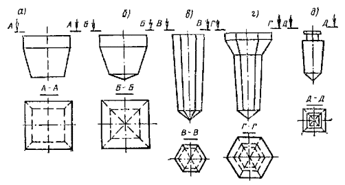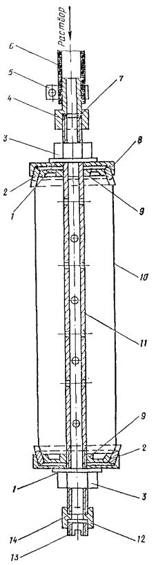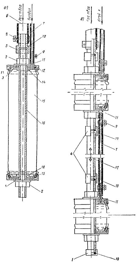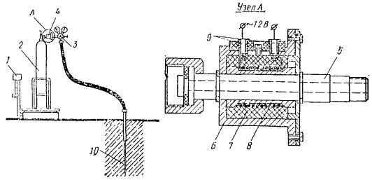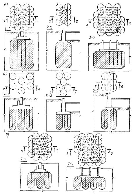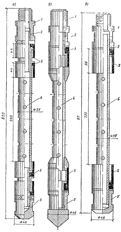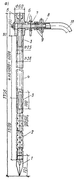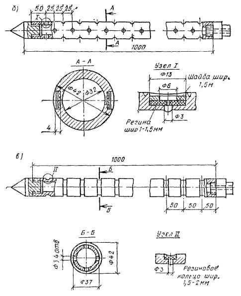 Рис. 58. Конструкция забивного инъектора для силикатизации и смолизации песчаных грунтов а - общий вид; б - перфорированные звенья с резиновыми клапанами; в - то же, с резиновыми кольцами; 1 - наконечник; 2 - перфорированное звено; 3 - соединительный ниппель; 4 - глухое звено; 5 - наголовник, 6 - ниппель наголовника; 7 - прижимная гайка; 8 - штуцер; 9 - хомутик; 10 - заглушка; 11 - шланг Колонну глухих труб инъектора составляют из звеньев длиной 1-1,5 м, имеющих на концах внутреннюю метрическую резьбу на длине 35 мм. Звенья труб соединяют ниппелем. Перфорированное звено инъектора обычно имеет длину 0,5-1,5 м и отверстия диаметром 2-3 мм. На рис. 58 показаны инъекторы двух видов: а) инъектор первого вида изготовлен из цельнотянутой толстостенной трубы, по периметру которой выполнены отверстия диаметром 3 мм, расположенные четырьмя рядами в шахматном порядке из расчета 60-80 отверстий на 1 м длины. Отверстия защищены от засорения грунтом резиновыми клапанами, состоящими из резинового кольца толщиной 1-1,5 мм и металлической шайбы толщиной 1,5 мм; б) инъектор второго вида, получивший наибольшее распространение, состоит из толстостенной трубы диаметром 32-42 мм, на боковой поверхности ее проточены круговые канавки, в которых просверлены отверстия диаметром 2-3 мм. Отверстия закрыты резиновыми кольцами, уложенными в канавки на глубину 2-3 мм (ширина канавки 8-10 мм). Толщина стенок цельнотянутых труб не менее 8 мм. Погружение и извлечение инъекторов, бурение и оборудование инъекционных скважин 5.73. При погружении инъекторов в грунты и бурении скважин следует принимать меры, предупреждающие отклонения инъекторов и скважин от проектного направления установкой кондукторов. Максимальные отклонения не должны превышать при глубине до 40 м - 1 %, а при большей глубине - 0,5 %. 5.74. При силикатизации и смолизации грунтов оснований существующих сооружений в стесненных условиях погружение инъекторов согласно п. 5.42 можно производить из специально пройденных технологических колодцев. Рис. 59. Конструкция забивного инъектора переменного сечения для силикатизации просадочных лессовых грунтов 1 - наконечник; 2 - перфорированное звено; 3 - переходной ниппель; 4 - глухое звено; 5 - ниппель для соединения глухих звеньев 5.75. Погружение инъекторов в грунты для последующей инъекции закрепляющих реагентов может производиться забивкой, задавливанием и установкой в предварительно пробуренные инъекционные скважины. Выбор способа погружения зависит от вида грунтов, естественно-исторических условий территории и глубины закрепления. Способ погружения инъекторов в грунты назначается проектом. 5.76. Погружение инъекторов в грунты забивкой применяют при силикатизации и смолизации песчаных грунтов, а также при закреплении лёссовых грунтов на глубинах менее 15 м. Способом задавливания обычно осуществляется внедрение инъекторов при химзакреплении грунтов с применением горизонтальной технологии из специальных технологических выработок (рис. 64). Рис. 60. Инъектор - тампон гидравлический, одинарный для силикатизации просадочных лессовых грунтов в скважинах 1 - шайба; 2 - кольцо уплотнительное; 3 - гайка; 4 - штуцер; 5 - хомут; 6 - шланг для подачи закрепляющих растворов; 7 - резиновая прокладка; 8 - крышка; 9 - муфта опорная; 10 - манжета из вулканизированной резины; 11 - труба перфорированная; 12 - шайба из резины; 13 - головка 