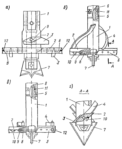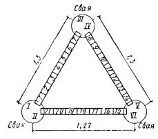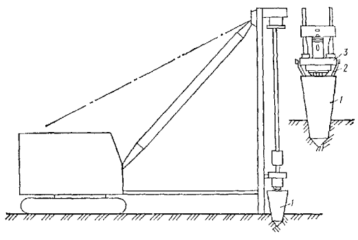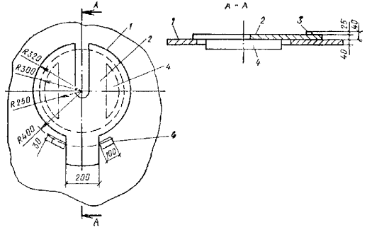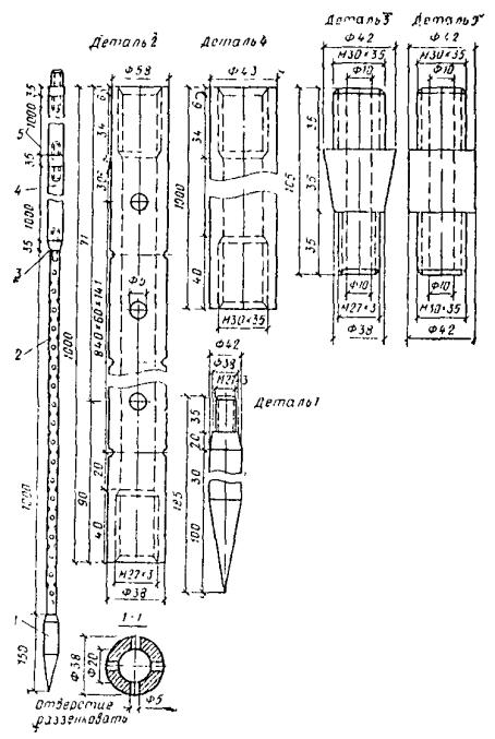 3.75. Трамбовка с помощью скобы крепится к рабочему тросу крана-экскаватора через специальную вставку из троса длиной 0,8-1 м, благодаря чему в момент удара ее о грунт исключается закручивание рабочего троса и его преждевременный износ. В целях снижения тягового усилия на лебедку допускается запасовка троса через полиспаст, для чего на крышке трамбовки устанавливается соответствующий блок. 3.76. Навесное оборудование на базе трактора С-100, ТМ-100 обеспечивает возможность работы с трамбовками массой до 2,5-3 т и состоит из направляющей рамы, прикрепленной к задней части трактора, системы блоков, подвесок, противовеса, устанавливаемого на передней части (см. рис. 6). Направляющая рама высотой 6-8 м состоит из двух стоек, по которым движется каретка. Стойки по высоте соединяются элементами жесткости, внутри которых проходит трамбовка. Стойки коробчатого сечения состоят из двух уголков. 3.77. Для повышения устойчивости на период вытрамбовывания котлованов к стойкам направляющей рамы крепятся аутригеры. На время переезда механизма с одного пункта на другой и установки трамбовки на центр будущего котлована аутригеры поднимаются. 3.78. Каретка имеет коробчатое сечение с пазами, которые входят в направляющие стойки. В центре каретки располагается блок, через который проходит рабочий трос от лебедки. Крепление каретки к трамбовке выполняется на болтах. Трамбовка крепится к рабочему тросу лебедки через полиспаст. 3.79. При использовании сваебойного агрегата для вытрамбовывания котлованов в качестве трамбовки используется полый металлический шаблон, жестко закрепленный с помощью болтов на молоте (рис. 7). Шаблон сваривается из металлического листа толщиной 12-16 мм с расположенными внутри ребрами жесткости. Для извлечения шаблона из грунта он с помощью подвесок крепится к станине молота. Максимальный размер трамбовки в верхней части по ширине при применении трубчатых дизель-молотов должен быть не более 1 м, а штанговых - 0,9 м. 3.80. Для глубинного уплотнения просадочных грунтов грунтовыми сваями используют стайки ударно-канатного бурения типа БС-1М или другие станки, позволяющие применить ударный снаряд массой не менее 3 т, что обеспечивает использование наконечников для пробивки скважин диаметром 0,5-0,6 м. Техническая характеристика станка Глубина уплотнения 18-20 м Диаметр скважины 500 мм Масса бурового снаряда 2700-3000 кг Высота подъема бурового снаряда 0,94-1,1 м Число ударов долота о забой 44-52 уд/мин Скорость подъема бурового снаряда 0,9 м/мин Высота мачты 1,45 м Ход Гусеничный самоходный Скорость передвижения 0,9 км/ч Удельное давление на грунт 0,7 кг/см2 Габариты станка в рабочем положении: длина 7000 мм ширина 3480 » высота 15050 » Габариты станка при перевозке: длина 9060 мм ширина 3480 » высота 4300 » Масса станка без бурового снаряда 90,8 т Диаметр инструментального каната 26-30 мм Длина каната H + 36 м Мощность электродвигателя 32 кВ Напряжение 380/220 В 3.81. Буровой снаряд, входящий в комплект станка, состоит из штанги и долот различной конструкции. Штанга подвешена на канате. Канатный замок скреплен со штангой коническим резьбовым соединением. Рис. 8. Конструктивная схема наконечника для прописки скважин 1 - сердечник-долото; 2 - оболочка; 3 - бетон; 4 - сварные швы; 5 - отверстие для подачи бетонной смеси под оболочку Рис. 9. Новая поворотная плита для свинчивания штанг ударного снаряд