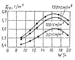 3.228. Патроны надежно прикрепляются к одной или двум нитям шпагата или отожженной проволоки и размещаются равномерно по глубине в пределах каждого однородного слоя. Длина цепочки патронов назначается с таким расчетом, чтобы верхний патрон располагался на 0,5-0,7 м ниже поверхности земли (устья шпура) во избежание выброса грунта при взрыве. До опускания заряда в скважину-шпур должны быть проверены ее вертикальность, глубина, число патронов, их расположение, длина заряда и соответствие их проекту. Заряд опускается в скважину-шпур непосредственно перед взрывом и должен находиться в натянутом состоянии под действием собственного веса. 3.229. Взрыв осуществляется в каждой скважине отдельно при помощи детонирующего шпура. Интервал между взрывами отдельных зарядов принимается не менее 1 мин. После взрыва и выхода газов измеряются глубина и диаметр полученной скважины. 3.230. При взрыве может образоваться завал части скважины грунтом. Если высота завала больше 1,5 м, скважина считается бракованной. В этом случае вначале трамбуют обвалившийся грунт, затем засыпают порции грунта с послойным уплотнением и в непосредственной близости изготавливают дополнительную грунтовую сваю. Если высота завала менее 1,5 м, при необходимости его вначале доувлажняют и утрамбовывают не менее чем 20 ударами снаряда, а затем засыпают первую порцию грунта с последующим уплотнением. 3.231. Скважины заполняют грунтом порциями, каждая из которых уплотняется станком БС-1М. В качестве грунтового материала используются суглинки и супеси (без включения растительных остатков и строительного мусора), имеющие оптимальную влажность. Отклонение от оптимальной влажности допускается в пределах 0,02-0,04. Если влажность предназначенного к засыпке в скважину грунта не отвечает требованию проекта, производят его доувлажнение. Ориентировочное количество воды, м3, необходимое для увлажнения 1 м грунта в зависимости от его влажности, принимается по табл. 5. 3.232. Доставленный к месту работ и подготовленный к засыпке грунт должен быть в короткий срок использован для набивки скважин. Если создается запас грунта, то должны быть приняты меры, предупреждающие возможное его высыхание или переувлажнение (покрытие грунта брезентом, хранение под навесом и т.п.). 3.233. Объем грунта в порции назначают из расчета получения столба рыхлого материала в скважине высотой не более 2 диаметров скважины. Грунт засыпают в скважину при поднятом ударном снаряде с помощью механизмов, снабженных дозаторами, равными 0,2 м3 (порядка 300 кг) при массе ударного снаряда 3 т. 3.234. Трамбование каждой порции грунта в скважине производится с помощью станка ударно-канатного бурения с массой ударного снаряда не менее 2 т. 3.235. Набивку скважин грунтом ведут до полного ее окончания. В случае перерыва в работе скважину следует закрыть, исходя из условий техники безопасности. Для набивки 0,8-1 м скважины требуется 300-400 кг грунта (одна порция), а для уплотнения его до проектной плотности достаточно 20 ударов, т.е. примерно 0,5 мин работы станка. 3.236. В зимнее время основными трудностями, вызывающими снижение производительности работ, являются: промерзаемость верхних слоев грунта, затрудняющая пробивку скважин и вызывающая отклонение ее оси от проектной; быстрое смерзание подвозимого грунта для засыпки скважин в процессе его складирова