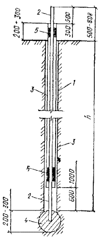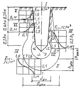 Примечание. Таблица составлена для γск = 1,6 т/м3 при Wp = 0,16 для супеси и Wр = 0,18 - для суглинка. Заливку расчетного количества воды при толщине просадочного грунта более 15 м производят в пределах всей уплотняемой площади или отдельными участками через дно котлована и дренажные скважины диаметром 150-200 мм. Дренажные скважины для замачивания пробивают или бурят между запроектированными грунтовыми сваями и заполняют дренирующим материалом (песком или щебнем). Число их назначают из расчета одна скважина на 10 м2 площади уплотняемого основания. 3.221. При производстве работ в зимнее время замачивание грунта производят только через дренажные скважины. Количество воды, поступающей в котлован, учитывают водомерами или другим способом, обеспечивающим точность расхода воды до 10 %. 3.222. После полного просачивания воды в грунт и подсыхания дна котлована производят контрольное бурение с отбором образцов для определения влажности. Если влажность грунта ниже предусмотренной проектом, производится дополнительное увлажнение. 3.223. Скважины-шпуры для установки цепочки патронов ВВ устраивают диаметром 80-85 мм. Проходка их осуществляется бурением или пробивкой. 3.224. Для пробивки скважин-шпуров применяют штанги диаметром 48-52 мм. Штанги забивают в грунт звеньями длиной 2-2,5 м вибратором или молотом весом 350-400 кг. В первое звено штанги ввинчивают конусообразный башмак диаметром 80-85 мм, изготовленный из металла, который обеспечивает легкое извлечение штанг после пробивки. Верх штанги для сохранения резьбы при забивке накрывается наголовником в виде стальной пробки или муфты с деревянной прокладкой. 3.225. Для обеспечения вертикальности скважин-шпуров штанги погружают через кондуктор. Извлечение штанг производят тем же копром, которым производилась пробивка. Проходка скважин-шпуров производится от периферии котлована к центру через одну. Пробивка оставшихся скважин-шпуров производится после расширения взрывом ранее пройденных и набивки их грунтом и фиксируется в журнале (прил. 5). 3.226. Для расширения скважин в просадочных грунтах применяются патроны фабричного изготовления. При их отсутствии патроны можно готовить на месте из плотной водонепроницаемой бумаги, накатанной в два-три слоя на деревянные болванки с последующей закаткой торца. Дно такой гильзы забивается по торцу болванки. Аммоний или другое ВВ засыпается в гильзы мерными стаканчиками по 50 г с точностью взвешивания до 0,5 г, после чего гильза закрывается. При повышении влажности ВВ в патронах их применение не допускается. 3.227. Для каждого слоя однородного грунта число патронов устанавливается на основе инженерно-геологического разреза исходя из степени глинистости грунта, характеризуемой числом пластичности и уточняется на основе опытных взрывов: