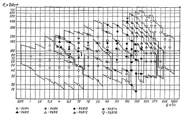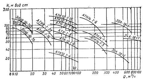 Технические данные выпускаемых в Советском Союзе скважинных насосов приведены в табл. 24, в которой приняты следующие обозначения для типоразмеров агрегатов: А - артезианский; В - водяной; Г - допускается повышенное содержание твердых механических примесей в воде; Н - насос; Т - турбинный; Тр - допускается повышенная температура воды; X - допускается химическая активность воды; Ц - центробежный; Э - с приводом от погружного электродвигателя. Первое число (для насосов типа ЭЦВ - первое после букв) - внутренний диаметр фильтровой колонны, уменьшенный в 25 раз и округленный; второе число - для насосов типа А - быстроходность; АНТ - рабочее колесо; ЭЦВ - производительность, м3/ч; третье число - для насосов типа А - число корпусов насоса; АТН - число рабочих колес; ЭЦВ - напор, м. Для насосов типа ЭЦВ перед буквами ставится порядковый номер модернизации, например: 1ЭЦВ12-160-65. Характеристики насосов приведены на рис 29 и 30. 4.24. В Советском Союзе выпускаются и поставляются комплектно иглофильтровые установки следующих типов: ЛИУ; УВВ; ЭИ и ЭВВУ (табл. 25). Все они могут быть использованы для гравитационного водопонижения. Для вакуумного водопонижения используются установки типов УВВ, ЭИ и ЭВВУ. Таблица 23