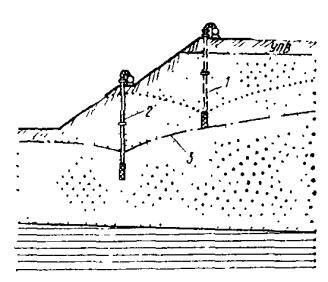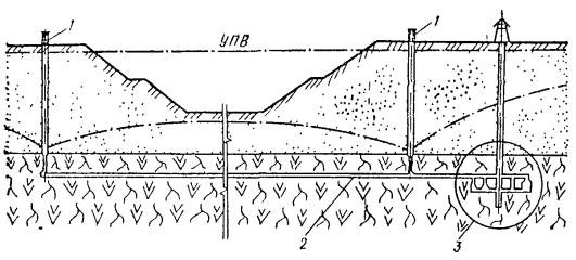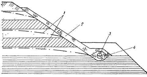 УСТРОЙСТВО ДРЕНАЖЕЙ4.30. Дренажи того или иного вида, имеющие непрерывное простирание (траншейные, трубчатые, пластовые и др.) могут применяться для различных задач водопонижения в разнообразных природных условиях. 4.31. Простейшим видом траншейных дренажей, применяемых для строительного водопонижения, являются канавки и передовые траншеи, устраиваемые в котлованах при водоотливе из них. Когда территория позволяет разместить дренажные траншеи вне котлованов сооружений, траншейный дренаж может быть использован для осушения значительных площадей, на которых необходимо вести работы ниже уровня подземных вод на протяжении длительного времени. В малоустойчивых грунтах нижняя, затопленная часть канав и траншей может быть заполнена фильтрующим материалом (камнем, щебнем, гравием). При необходимости использования площади, занятой канавами или траншеями, последние после укладки фильтрующего материала могут быть засыпаны грунтом с постепенным переходом в материале засыпки от крупных фракций к мелким (т.е. с устройством обратного фильтра) для предохранения от засорения его водопроводящей части, образуя таким образом закрытый беструбчатый дренаж. 4.32. Трубчатые дренажи могут быть использованы для строительного водопонижения в тех случаях, когда они предусматриваются для постоянных дренажных систем. В этом случае они должны быть выполнены заблаговременно с целью защиты заглубленного сооружения не только в период эксплуатации, но и в период его строительства. Однако трубчатые дренажи могут применяться и только на период строительства, например, на откосах долго существующих котлованов (рис. 32) и в других случаях, когда это оправдано экономически. Рис. 32. Дренаж на откосах котлована 1 - пониженные уровни подземных вод; 2 - песчаная пригрузка; 3 - дренажная труба; 4 - засыпки гравием При устройстве трубчатых дренажей, после отрывки траншеи, необходимо отобрать пробы окружающего грунта, уточнить его гранулометрический состав и соответствующий ему состав песчано-гравийной обсыпки, требования к материалу для нее и при необходимости к материалу фильтровых покрытий согласно пп. 4.16 и 4.17. 4.33. Дренажи в виде проходных и полупроходных подземных галерей ввиду их значительной стоимости применяются, в основном, в период эксплуатации сооружений и рудников в качестве постоянного средства осушения территорий предприятий, населенных пунктов, для борьбы с оползнями и т.д. Такие дренажи при их заблаговременном исполнении возможно использовать и для водопонижения в строительный период. При их устройстве необходимо руководствоваться действующими нормативными материалами по подземным горным выработкам и гидротехническим тоннелям. 4.34. Работы по устройству траншейных, трубчатых, галерейных дренажей должны начинаться с прокладки сбросных участков от дренажной сети до открытых водоприемников или существующих коллекторов ливневой канализации при самотечном выпуске, а в случае перекачки - со строительства насосной станции и водоотвода. 4.35. Пластовый дренаж (развитый по площади слой фильтрующего материала) применяется в сочетании с трубчатыми дренами (или беструбчатыми закрытыми дренами) при строительном водопонижении на откосах котлованов (см. рис. 32), а также в основаниях сооружений (например, когда необходимо забетонировать фундаментную п