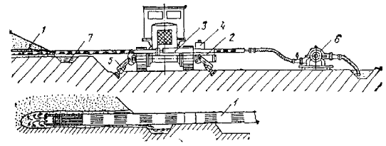 * В комплект установок типа ЭВВУ дополнительно входят фильтровые оболочки, а фильтровые звенья не имеют сетчатого покрытия. Организация водоотлива облегчается при разработке грунтов методами гидромеханизации, так как откачка подземных вод обычно совмещается с удалением пульпы, а в забое допускается разрыхление грунтов фильтрационным притоком. 4.26. Разработка крупных и глубоких котлованов с водоотливом осуществляется ярусами. Разработка каждого яруса начинается с проходки пионерной (разрезной) траншеи глубиной, несколько превышающей высоту яруса. Уклон траншеи принимается противоположным направлению движения экскаватора. При этом в начале траншеи (вблизи съезда) устраивается водоприемный зумпф для сбора фильтрующей воды. Насосы для откачки воды устанавливаются вблизи зумпфа на дне траншеи или у верхней бровки траншеи на поверхности земли. Последнее рекомендуется при больших притоках. Высота яруса регламентируется фактической высотой всасывания насосов и не превышает 3-4 м. Рис. 31. Открытый водоотлив в котловане 1 - дренажная канава; 2 - зумпф; 3 - пониженный уровень подземных вод; 4 - дренажная пригрузка; 5 - насос По окончании разработки траншеи на уровне ее дна в месте расположения зумпфа устраивается насосная станция, действующая в течение всего периода разработки яруса. При большой площади котлована в пределах одного яруса могут устраиваться дополнительные насосные станции. По окончании выемки земли по контуру дна выработки устраиваются водосборные траншеи. В аналогичном порядке осуществляется водоотлив на последующих ярусах разработки котлована. 4.27. Водоотлив непосредственно из передовых траншей или из котлованов, не имеющих специальных зумпфов, допускается, когда не требуется их полного осушения, например, при подводной разработке грунтов грейферами или земснарядами. Когда требуется полное осушение котлована, должны быть заблаговременно подготовлены зумпфы и обеспечен беспрепятственный сток воды к ним. Котлованы, разрабатываемые в водоносных глинистых грунтах, которые служат основанием сооружений, рекомендуется переуглублять на 20-40 см ниже отметки подошвы фундаментов и выполнять втрамбовку и сплошную подсыпку щебнем или гравием. 4.28. Разработка котлованов подводным способом ведется черпанием грунта из-под воды землечерпательным (землесосным) снарядом или экскаватором, оборудованным грейфером или ковшом драглайна. Обычно она сопровождается снижением уровня воды в выемке. Скорость снижения уровня подземных вод в грунтовом массиве вблизи откосов меньше скорости снижения уровня воды в самом котловане и еще в большей мере отстает развитие депрессии вдали от котлована. При этом возникает опасность значительного возрастания гидравлического градиента фильтрации в приоткосной зоне. При определенных для каждого конкретного грунта значениях выходного градиента фильтрации и величины уступа может наступить разрушение грунта в откосах. Для фильтрующих грунтов - это суффозионные явления, которые могут повлечь за собой образование в грунтовом массиве каверн, пещер, пустот, провальных воронок и, наконец, обрушение на отдельных участках откоса. В слабофильтрующих грунтах значительное давление подземных вод изнутри массива в сочетании со взвешивающим воздействием воды может вызвать оплывание и оползан