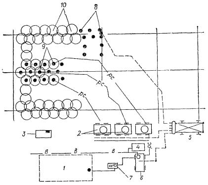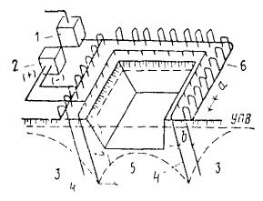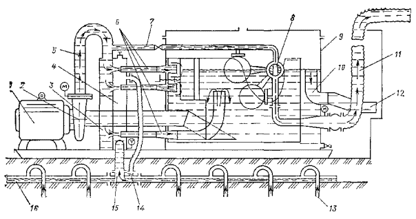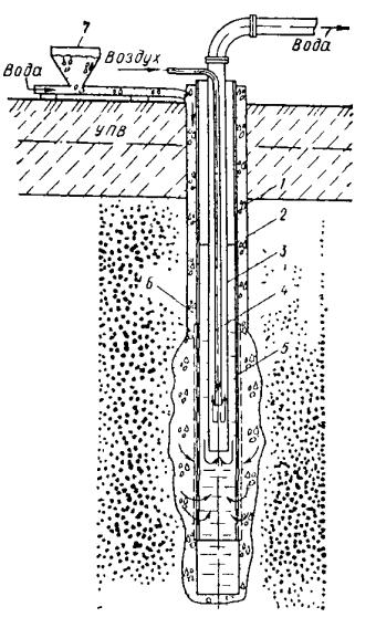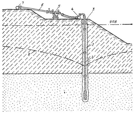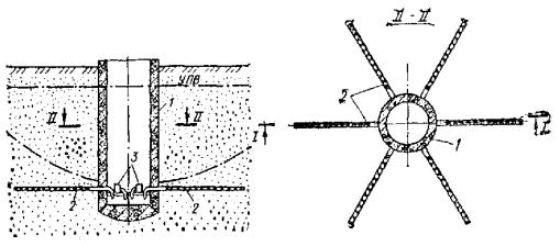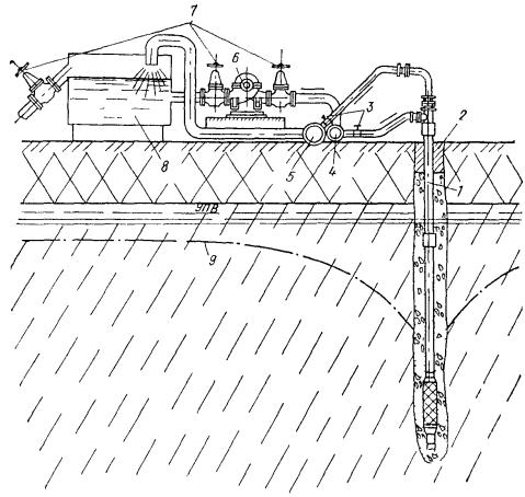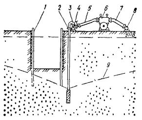 Удаление глинистой корки может осуществляться размывом струей воды, подаваемой через гидравлические насадки. 4.58. Электрогидравлический, пневмоударный и ультразвуковой методы обработки скважин следует применять для восстановления проницаемости водоприемной поверхности фильтра и материала песчано-гравийной обсыпки (или породы прифильтровой зоны) долгодействующих скважин, подвергающихся зарастанию (кольматации) химическими осадками, осаждающимися из подземных вод. 4.59. Механическая обработка внутренней полости фильтра и надфильтровых труб должна производиться при помощи проволочных ершей, скребков и шарошек. 4.60. Кроме вышеуказанной специальной обработки скважин периодически (через 6-12 мес) следует производить чистки скважин от осаждающихся в них механических примесей, содержащихся в откачиваемых водах. 4.61. Как правило, эффективность того или иного способа увеличения производительности скважин определяют экспериментальным путем. Приступать к работам по борьбе со снижением дебитов необходимо сразу же после получения сведений о начале зарастания фильтров, но не позже, чем через год после начала работы скважин. За состояние всех водопонизительных скважин, особенно из имеющих надземных устройств (самоизливающихся, сквозных фильтров, водопоглощающих), должно отвечать персонально какое-то должностное лицо (ИТР). Скважины должны быть ограждены от возможных повреждений механизмами и от попадания в них через устье посторонних предметов. УСТРОЙСТВО ИГЛОФИЛЬТРОВЫХ СИСТЕМ4.62. Иглофильтровый способ водопонижения заключается в использовании для забора воды из грунта часто расположенных скважин с трубчатыми водоприемниками малого диаметра - иглофильтров, соединенных общим всасывающим (в случае легких иглофильтров) или напорным (в случае эжекторных иглофильтров) коллектором с центральной (для группы иглофильтров) насосной установкой. Иглофильтры чаще всего погружаются гидравлическим способом. При этом образуется скважина, диаметр которой значительно больше диаметра иглофильтра. Зазор в скважине между грунтом и иглофильтром, как правило, следует заполнять песчано-гравийной обсыпкой. При гравитационном водопонижении в достаточно крупнозернистых грунтах, не требующих применения обсыпки (с коэффициентом фильтрации более 5 м/сут), допускается заполнение зазора в скважине оплывающим грунтом, если это не опасно для вблизи расположенных сооружений. При наличии в толще грунта, прорезаемого иглофильтрами, трудноразмываемых слоев иглофильтры устанавливаются в предварительно пробуренные скважины. Скважины бурятся также для относимых к иглофильтрам вакуум-концентрических водоприемников (см. установки типа ЭВВУ). Извлечение иглофильтров производится с подмывом для уменьшения сил трения по боковой поверхности иглы. Иглофильтры применяются в виде линейных (рис. 43) и кольцевых (рис. 44) систем, которые могут быть совершенными (доходящими до водоупора) и несовершенными (не доходящими до водоупора). Рис. 43. Линейная система иглофильтров 1 - крепление траншеи; 2 - иглофильтры; 3 - соединительный шланг; 4 - всасывающий коллектор; 5 - гофрированный шланг; 6 - насосный агрегат ЛИУ; 7 - напорный трубопровод; 8 - сбросной трубопровод; 9 - пониженный уровень подземных вод Рис. 44. Контурная система иглофильтров 1 - насосный агрегат; 2 - иглофильтр
