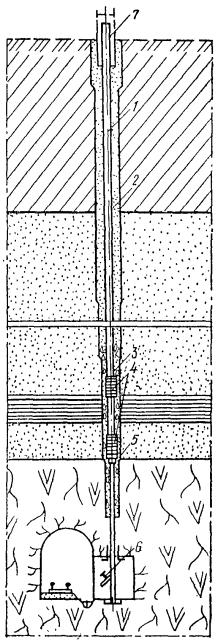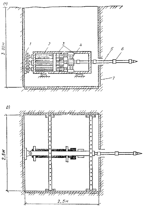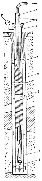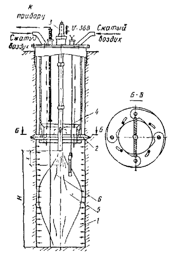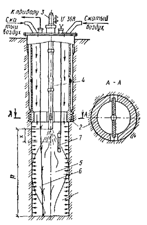 τ - продолжительность обжига, вычисляемая из эмпирической зависимости, ч τ = 34461 (rр2,326 + 0,7345 · 10-2W1,275) / Qт, (16) Рис. 74. Схема термического закрепления грунтов с применением многоспайной термопары и винтообразного отсекателя рабочего объема скважины 1 - нагревательная скважина; 2 - отсекатель; 3 - форсунка; 4 - удлинитель форсунки; 5 - факел горения смесей; 6 - термопары; 7 - запальник Рис. 75. Схема термического закрепления грунтов с применением термопары передвижного действия и отсекателя рабочего объема скважины с раздвижными ножами 1 - нагревательная скважина; 2 - отсекатель; 3 - форсунка; 4 - удлинитель форсунки; 5 - факел горения смесей; 6 - термопара где Qт - тепловая мощность скважины, которая составляет 10-20 МДж/ч на метр глубины скважины; 34461 - эмпирический коэффициент, МДж/м; 0,7345 · 10-2 - эмпирический коэффициент, м; W - весовая влажность грунтов, %. 5.257. Для бурения скважин на открытых площадках следует применять буровое оборудование, указанное в прил. 27 (табл. 1). 5.258. Бурение скважин в труднодоступных местах, стесненных условиях, подвальных и полуподвальных помещениях целесообразно осуществлять с помощью станков, приведенных в прил. 27 (табл. 2). 5.259. Для подачи воздуха в скважины следует применять воздуходувное оборудование, технические характеристики и экономические показатели которых даны в прил. 27 (табл. 3). 5.260. Для производства работ по глубинному обжигу грунтов применяются (рис. 74, 75): устройства для генерации тепла (форсунки, горелки, электрические нагреватели); затворы, экраны и отсекатели, обеспечивающие герметизацию и экранирование отдельных участков нагревательных скважин и обработку их по заходкам; разводящие сети и трубопроводы, емкости для топлива, трансформаторные и другие установки; контрольно-измерительная аппаратура, включающая комплекты термопар и измерительных приборов, манометры, датчики температуры, сигнальные реле, а также оптические пирометры и устройства для визуального наблюдения за процессами внутри нагревательных скважин. 5.261. Процесс производства по глубинному обжигу грунтов включает три основных периода: подготовительный, основной, заключительный. 5.262. В подготовительном периоде осуществляется инженерное освоение участка, разбивка и бурение нагревательных и вспомогательных скважин, монтаж оборудования, инженерных сетей и коммуникаций и подключение их к внешним источникам энергии, монтаж затворов, экранов и отсекателей, опробование всей системы, монтаж средств контроля и оповещения. 5.263. Разбивку осей под нагревательные скважины следует производить от основных осей зданий и сооружений. Отклонение не должно превышать ±5 см. 5.264. Бурение нагревательных скважин должно производиться по захваткам. При этом бурение скважин на последующих захватках следует выполнять в процессе обжига грунта на предыдущих захватках. 5.265. Для бурения скважин могут применяться буровые установки, указанные в прил. 27 (табл. 1), или другие установки, обеспечивающие необходимый диаметр скважин. Проходка скважин производится одним или несколькими диаметрами. 5.266. Испытание дебитов скважин должно производиться нагретыми газами с применением принятого к производству способа обжига грунта, оборудования и режима технологической обработки. Управление газопропускной способностью нагревательных скважин осуществляется уплотнением или рыхле