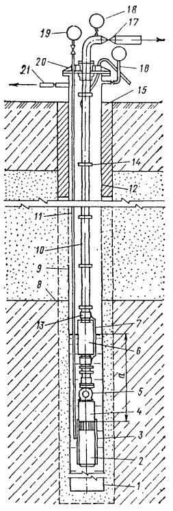 Рис. 40. Вакуум-скважина 1 - отстойник; 2 - электродвигатель; 3 - кожух; 4 - насос; 5 - обратный клапан; 6 - стабилизатор динамического уровня; 7 - кабель; 8 - поверхность водоупора; 9 - фильтр; 10 - напорный трубопровод; 11 - трубка прибора для измерения уровня воды в скважине; 12 - надфильтровая труба; 13 - муфта; 14 - «пояс»; 15 - глиняный тампон; 16 - трубка вакуумметра; 17 - вентиль; 18 - манометр; 19 - вакуумметр; 20 - крышка; 21 - трубка для подключения вакуум-насоса в) с обратной промывкой чистой водой (всасывающее бурение) - для скважин глубиной до 300 м и диаметром до 1000 мм и более при отсутствии включений валунов, больших скоплений крупной гальки и при залегании уровня подземных вод на глубине 3 м и ниже от поверхности земли. При бурении с промывкой в набухающих грунтах должны применяться специальные реагенты, препятствующие набуханию; в крепких грунтах к промывочной жидкости следует добавлять понизители твердости. В соответствующих условиях вышеуказанные способы могут применяться и в различных сочетаниях. Диаметр бурения под фильтровую колонну принимается по наружному диаметру предусмотренной проектом фильтрующей обсыпки. При применении фильтров без обсыпки диаметр бурения должен быть больше диаметра фильтра на 50-100 мм. В процессе бурения скважин следует отбирать образцы и определять зерновой состав грунтов, уточнять литологический разрез в месте скважины, а при бурении без крепления выполнять электрокаротаж для уточнения интервалов установки фильтров. В неустойчивых грунтах скважины при бурении должны закрепляться обсадными трубами. В телескопическом креплении скважин предусматриваются, как правило, следующие колонны обсадных труб: шахтовое направление, кондуктор, технические колонны. Нижняя часть каждой колонны оборудуется короткой утолщенной трубой (0,4-0,5 м) с коническим срезом (башмак). При ударном бурении в неустойчивых грунтах крепление скважин должно производиться одновременно с разработкой грунтов, при этом башмак обсадной колонны должен опережать забой скважины не менее чем на 0,5 м. При опускании в незакрепленную скважину колонны обсадных труб зазор между ними и грунтом в зависимости от геологического разреза, типоразмеров породоразрушающего инструмента, высоты незакрепленного участка скважины и способа цементирования затрубного пространства (при необходимости в нем) принимается: при диаметре труб до 700 мм 80-100 мм » » » более 700 мм 100-150 » Конечный диаметр бурения скважин для сквозных фильтров должен назначаться с учетом размещения в скважине прибора для определения координат ее забоя. В скважинах, предназначенных для установки в них насосов с трансмиссионным валом, отклонение от вертикали не должно превышать 0,005 от глубины скважины. Колонны обсадных труб для временного закрепления стенок скважины, не предусмотренные на период ее работы в водопонизительной системе, должны извлекаться. В колоннах обсадных труб, предусмотренных проектом для оставления в грунте на период эксплуатации скважины, должна извлекаться их свободная часть. При этом верхний обрез обсадной трубы, остающейся в скважине, должен находиться выше башмака предыдущей колонны не менее чем на 3 м при глубине скважины до 50 м и не менее чем на 5 м при большей глубине скважины; кольцевой зазор между оставшейся частью колонны и предыдущей колонной обсадных труб должен б