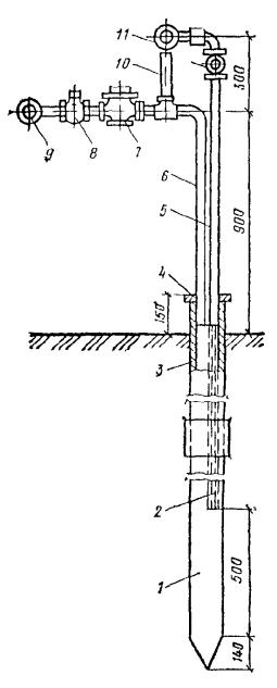 Рис. 67. Технологические схемы нагнетания закрепляющих растворов в грунты а - с использованием пневмобака; б - насоса; в - дозировочного агрегата; 1 - пневмобак; 2 - насос; 3 - дозировочный агрегат; 4 - емкость с раствором; 5 - смеситель; 6 - распределитель; 7 - счетчики расхода; 8 - инъекторы 5.83. Оборудование для нагнетания растворов должно быть оснащено следующей, контрольно-измерительной аппаратурой: обычными либо электроконтактными манометрами, рассчитанными на давление до 0,6-1 МПа с ценой деления шкалы 0,01 МПа; счетчиками расхода с погрешностью измерения до ±2 % и ценой деления не более 0,005 м3; секундомером или часами. Рис. 68. Схема пневматической установки для нагнетания закрепляющих растворов в грунты 1 - патрубок с вентилем для подачи раствора к инъекторам; 2 - люк для осмотра и чистки емкости; 3 - патрубок с вентилем для подачи сжатого воздуха; 4 - вентиль, регулирующий давление; 5 - манометр; 6 - предохранительный клапан; 7 - контрольный вентиль; 8 - корпус емкости; 9 - шкала расхода; 10 - водомерное стекло; 11 - патрубок с вентилем для отбора проб растворов; 12 - салазки Шланги для подачи раствора должны быть рассчитаны на рабочее давление 0,6-1 МПа и иметь условный проход не менее 20-25 мм. 5.84. Нагнетание рабочего раствора должно производиться по заходкам в объеме и в технологической последовательности, предусмотренной проектом. Количество раствора и его плотность, порядок нагнетания и величина заходок, а также диаметр скважин могут быть изменены проектной организацией по результатам контрольного закрепления. 5.85. Перед нагнетанием реагентов в грунты инъектор должен быть промыт водой или продут воздухом под давлением, не превышающим предельно допустимого давления, указанного в проекте. Количество подаваемой воды должно назначаться таким образом, чтобы обеспечить освобождение от раствора перфорированной части инъектора или действующей части скважины. Порядок нагнетания растворов по глубине зависит от способа погружения, характера и степени однородности грунта по водопроницаемости. Очередность устанавливается проектом. 5.86. При двухрастворной силикатизации грунтов в сплошном массиве жидкое стекло и раствор хлористого кальция нагнетаются рядами с чередованием инъекторов через один ряд. Раствор хлористого кальция следует нагнетать как можно быстрее после нагнетания жидкого стекла. Перерывы между нагнетанием жидкого стекла и хлористого кальция не должны быть более указанных в табл. 38. Таблица 38