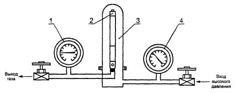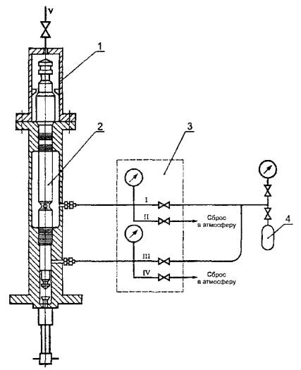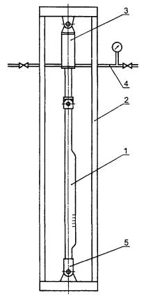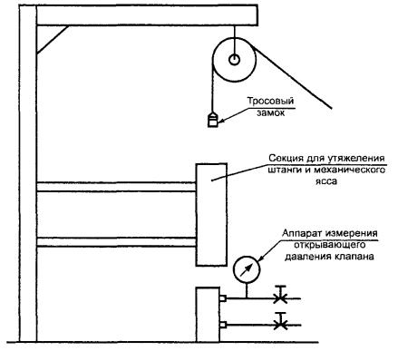 где Р1 и Р2 крайние значения усредненной линии участка А диаграммы; dx - максимально эффективное перемещение штока клапана в пределах наклонной линии участка А. 5.4.3.4 Испытание клапана на работоспособность 5.4.3.4.1 Испытание проводят на стенде (рисунок 13), при этом утяжеленная штанга должна быть длиной (1500 ± 80) мм и номинальным диаметром 38,1 мм; стержень механического ясса должен быть длиной (500 ± 50) мм и номинальным диаметром 38,1 мм. Рисунок 13 - Стенд для испытания установки клапана 5.4.3.4.2 Скважинную камеру устанавливают в аппарат для измерения открывающего клапан давления. Посадку клапана в карман скважинной камеры осуществляют при помощи пяти ударов яссом со свободно падающим утяжеленным стержнем. Спускной инструмент освобождают движением ясса вверх. Измеряют открывающее давление клапана, вставленного в карман скважинной камеры. Измеряют и регистрируют температуру окружающей среды. Результаты испытаний регистрируют в протоколе по форме 2 (приложение А). 5.4.4.4.3 Результаты испытаний оформляют актом, в котором указывают обозначение и заводской номер клапана, дату, результаты испытания с указанием: - давления установки клапана; - давления опрессовки; - диаграмм перемещения штока в зависимости от давления на клапан; - наилучшей наклонной линии участка А диаграммы; - нормы нагрузки сильфонной сборки; - максимально эффективного перемещения клапана. ПРИЛОЖЕНИЕ А(справочное) Форма 1 Форма протокола испытаний