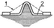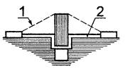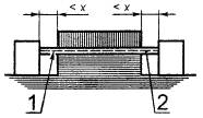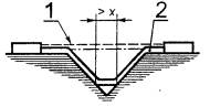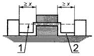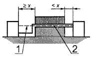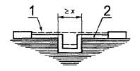 Условие. V-образный паз шириной большей X Правило. Электрический зазор находится на линии визирования. Путь утечки повторяет контуры паза, но «укорачивает» низ паза за счет отрезка X Пример 4 Условие. Рассматриваемый отрезок имеет форму выступа Правило. Электрическим зазором является наикратчайшее расстояние через вершину выступа по воздуху. Путь утечки повторяет контуры выступа 1 - электрический зазор; 2 - путь утечки; X - 2,5 мм Рисунок 2 - Определение путей утечки и электрических зазоров, лист 1