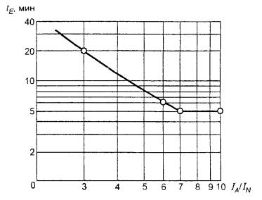 Если общая сумма коэффициентов превышает 5, то электродвигатель или представительный образец типового ряда необходимо подвергнуть испытанию согласно 6.2.3. 5.2.4.4 Температура на поверхности ротора не должна превышать предельно допустимое значение даже при пуске электродвигателя. Температура на поверхности ротора должна быть менее 300 °С или соответствовать значениям, оговоренным в 4.8. Примечание - Компоненты короткозамкнутой машины следует выполнять из немагнитного или изолированного материала. В противном случае их температура на поверхности в режиме короткого замыкания электродвигателя может превысить температуру стержней ротора. К таким компонентам относят удерживающие кольца, уравновешивающие диски, центрирующие кольца, вентиляторы или кожух забора воздуха. 5.2.4.5 При применении электродвигателя с защитным устройством от токов перегрузки, используемым для защиты от превышения предельной температуры, необходимо определить время tE, отношение IA/IN и указать их значения в маркировке электродвигателя. Длительность времени tE должна быть такой, чтобы до его истечения электродвигатель с заторможенным ротором отключался защитным устройством оттоков перегрузки. В целом это возможно, если превышается минимальное значение tE, график зависимости которого от отношения IA/IN представлен на рисунке 3. Значения времени tE менее величин, показанных на рисунке 3, допускаются только в случае, если в электродвигателе применено соответствующее защитное устройство от перегрузки, эффективность которого подтверждена испытаниями. Это устройство должно быть указано в маркировке электродвигателя. Ни в коем случае: - при использовании защитного устройства от токов перегрузки время tE не должно быть меньше 5 с; - отношение IA/IN не должно превышать 10. 5.2.4.6 При применении в обмотках электродвигателя датчиков температуры, соединенных с защитными устройствами и предотвращающих превышение температуры, необходимо определить отношение IA/IN и указать его значение в маркировке электродвигателя. Время tE определять не требуется. Датчики температуры обмотки, соединенные с защитными устройствами, считают удовлетворяющими требованиям температурной защиты электродвигателя, если выполняются требования 4.8.4 даже в режиме короткого замыкания электродвигателя. Соответствующие защитные устройства следует идентифицировать при маркировке электродвигателя в табличке, устанавливаемой на его корпусе. Значение отношения IA/IN ни в коем случае не должно превышать 10. 5.2.4.7 Электродвигатели, питаемые напряжением от преобразователя переменной частоты, следует либо оценивать согласно 5.2.4.9, либо испытывать вместе с преобразователями, указанными согласно ГОСТ Р 51330.0 в нормативно-технической документации, и в комплекте с предусмотренными защитными устройствами. 5.2.4.8 В электродвигателях на напряжение менее 1 кВ, питаемых от преобразователя, конструкция последнего должна предусматривать ограничение максимального напряжения относительно земли до 1 кВ и скорости повышения напряжения dU/dt до 500 В/мкс. В электродвигателях на напряжение 1 кВ и выше, имеющих намотку по определенной форме и питаемых от преобразователя, конструкция последнего должна предусматривать ограничение максимального напряжения относительно земли до двукратного номинального линейного напряжения