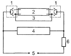 Для патронов типов Е13, Е26 и Е39 следует провести эквивалентное испытание исходя из требований, предъявляемых к различным типам цоколя и указанных в ГОСТ 2746, с учетом различий между цоколями ламп. Испытуемый цоколь лампы частично вывинчивают поворотом на 15°, и прилагаемое затем поворотное усилие для полного вывинчивания лампы не должно быть меньше минимального усилия, приведенного в таблице 11. 6.3.2 Тепловое испытание осветительных устройств с люминесцентными трубками Последовательно к лампе подсоединяют диод и на лампу подают напряжение, равное 110 % от номинального. В конце испытания температура не должна превышать указанную в ГОСТ Р 51330.0 для соответствующего температурного класса. Затем при подсоединенном диоде на лампу подают номинальное напряжение, при этом не должно произойти превышения предельной температуры, указанной в таблице 3 (пункт 16, измерение термометром сопротивления). 6.3.3 Испытание ламповых двухштырьковых цоколей на воздействие диоксида серы Контакты и соединения ламповых двухштырьковых цоколей на воздействие диоксида серы испытывают по ГОСТ 28226 в течение 21 сут. Контакты при этом должны быть полностью собраны. После испытания сопротивление контакта не должно возрасти более чем на 50 % от первоначального значения. Штыри представительного образца лампового цоколя должны быть выполнены из латуни с последующим шлифованием до шероховатости поверхности не менее 0,001 мм и химическим осветлением. Сами штыри и их расположение должны соответствовать требованиям, предъявляемым к их размерам по ГОСТ 9806. 6.3.4 Испытание на вибрацию осветительных устройств с двухштырьковыми цоколями Испытания проводят согласно ГОСТ 28203. Собранный образец лампы крепят на жестком испытательном стенде и подвергают воздействию частоты от 1 до 100 Гц. При частоте от 1 до 9 Гц амплитуда должна составлять 1,5 мм, а при частоте от 9 до 100 Гц испытуемый образец подвергают ускорению 0,5g. Скорость качания частоты должна составлять 1 октава/мин при воздействии 20 циклов в каждой из ортогональных плоскостей. После воздействия вибрации не должно быть видимых механических повреждений ни в одной из частей лампы. Далее, последовательно через каждую группу контактов лампы пропускают ток от источника постоянного тока, как показано на рисунке 4. Если контакты лампового патрона механически различны, то испытание следует повторить с реверсированными контактами под напряжением. Специальную лампу для испытаний получают путем пробоя катодов током высокого напряжения и установки легкого по массе соединения в лампе. Ток во время испытания должен быть равен номинальному действующему значению тока лампы. Во время испытания не должно быть прерывания тока или изменения напряжения контактов. 1 - ламповый патрон; 2 - лампа; 3 - соединение; 4 - осциллограф; 5 - источник постоянного тока на 24 В; 6 - резистор Рисунок 4 - Схема испытания осветительного устройства на вибрацию 6.4 Измерительные приборы и измерительные трансформаторы6.4.1 Повышение температуры трансформаторов тока с накоротко замкнутой вторичной обмоткой, а также токоведущих частей измерительных приборов при токе Ith, пропускаемом в течение 1 с, можно определить при помощи испытаний или расчетов. При расчетах следует учитывать температурный коэффициент сопротивления, а тепловыми потерями можно пренебречь. 6.4.2 Дина