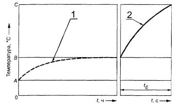 где j - плотность начального пускового тока, А/мм2; b - коэффициент приведения, учитывающий рассеивание тепла от пропитанных обмоток, равный 0,85; а - коэффициент, учитывающий материал обмоток, К×мм4/(А2×с). Для меди а = 0,0065 К×мм4/(А2×с). А.5 Определение времени tE А.5.1 На рисунке А.1 показана методика определения времени tЕ. Из предельной температуры С вычитают максимальную окружающую температуру А (обычно 40 °С) и величину, характеризующую повышение температуры в номинальном режиме работы, - отрезок АВ на рисунке А.1. Время tЕ определяют по полученной разности ВС и скорости повышения температуры в электродвигателе с заторможенным ротором (измеряют или рассчитывают). Для ротора и статора проводят отдельные расчеты. Наименьшее из двух значений принимают за время tЕ для электродвигателя соответствующего температурного класса. А - наивысшая допустимая окружающая температура; В - температура в номинальном режиме работы; С - предельная температура; t - время; 1 - повышение температуры в номинальном режиме работы; 2 - повышение температуры статора и ротора при испытании электродвигателя с заторможенным ротором Рисунок А.1 - График определения времени tЕ А.6 Электродвигатели с жесткими пусковыми условиями или снабженные специальными защитными устройствами (например, устройствами контроля температуры обмоток) следует испытывать с указанными защитными устройствами. А.7 Электродвигатели, образующие блоки с преобразователями и защитными устройствами, следует подвергнуть испытанию, которое должно показать, что в условиях эксплуатации блока электродвигателя и преобразователя не происходит превышения предельной температуры. ПРИЛОЖЕНИЕ Б(обязательное) Испытание специальных резистивных нагревательных устройств и блоковБ.1 Резистивные нагревательные устройства, подвергаемые механическому воздействию Гибкие резистивные нагревательные устройства, такие как нагревательные кабели и ленты, не защищенные механически оболочкой и отвечающие требованиям к оболочкам, изложенным в ГОСТ Р 51330.0, следует подвергнуть испытаниям на раздавливание и низкотемпературному испытанию на сгибание согласно [2]. Б.2 Погружные резистивные нагревательные устройства и блоки Образец или часть образца на 14 сут погружают в водопроводную воду на глубину 50 мм. Затем соответствие сопротивления изоляции испытуемых образцов предъявляемым требованиям определяют по методике, изложенной в 6.8.3, перечисления а), б). Примечание - Это испытание не предназначено для проверки пригодности резистивного нагревательного устройства или блока для использования в другой среде помимо воды или при давлении св. 500 Па. Б.3 Резистивные нагревательные устройства или блоки с гигроскопическим изолирующим материалом Части устройства, обеспечивающие герметичность, подвергают воздействию температуры (80 ± 2) °С в течение 28 сут при относительной влажности не менее 90 %. После этого образец насухо вытирают и соответствие сопротивления изоляции предъявляемым требованиям определяют испытанием по методике 6.8.3, перечисления а), б), но без погружения в воду. Б.4 Проверка предельной температуры резистивных нагревательных устройств за исключением нагревательного сетевого кабеля, блоков, панелей и систем Б.4.1 Испытание проводят в соответствии с Б.4.2, Б.4.3 или Б.4.4. Испытание следует проводить после стабилизации