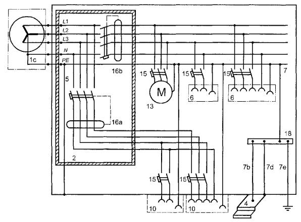 1с - присоединение генератора; 2 - корпус класса 2 или его эквивалент до первого устройства защиты, обеспечивающего автоматическое отключение питания; 4 - лестница (если имеется) из проводящего материала; 5 - присоединение нейтрали к проводящей конструкции установки; 6 - розетки для использования внутри установки; 7 - основной проводник системы уравнивания потенциалов; 7b - подсоединение к проводящим наружным лестничным ступеням; 7d - подсоединение к проводящему корпусу установки; 7е - подсоединение к заземляющему устройству; 10 - розетки для подсоединения электроприемников, используемых снаружи установки; 13 - электроприемники, используемые внутри установки; 15 - устройство защиты от токов перегрузки (например, автоматический выключатель или предохранитель); 16а - автоматический выключатель дифференциального тока на 30 мА для защиты оборудования, используемого снаружи установки; 16b - автоматический выключатель дифференциального тока для защиты оборудования, используемого внутри установки; 18 - главный зажим (шина) заземления Рисунок А.1 - Пример подсоединения павильона к низковольтному генератору класса 2 или к сети с системой заземления TN-S