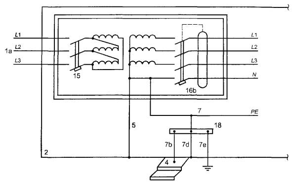 1а - подключение установки к питанию через трансформатор с простым отсоединением; 2 - корпус класса 1 или его эквивалент до первого устройства защиты, обеспечивающего автоматическое отключение питания; 4 - лестница (если имеется) из проводящего материала; 5 - присоединение нейтрали к проводящей конструкции установки; 7 - основной проводник системы уравнивания потенциалов; 7b - подсоединение к проводящим наружным лестничным ступеням; 7d - подсоединение к проводящему корпусу установки; 7е - подсоединение к заземляющему устройству; 15 - устройство защиты от токов перегрузки (например, автоматический выключатель или предохранитель); 16b - автоматический выключатель дифференциального тока для защиты оборудования, используемого внутри установки; 18 - главный зажим (шина) заземления; Рисунок А.2 - Пример присоединения установки с простым отсоединением и системой заземления TN