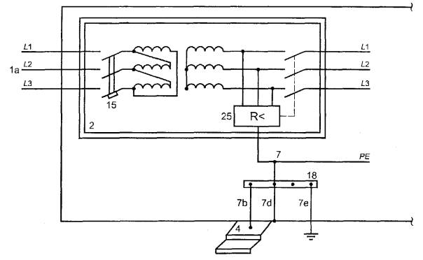1a - подключение установки к питанию через трансформатор с простым отсоединением; 2 - корпус класса 2 или его эквивалент до первого устройства защиты, обеспечивающего автоматическое отключение питания; 4 - лестница (если имеется) из проводящего материала; 7 - основной проводник системы уравнивания потенциалов; 7b - подсоединение к проводящим наружным лестничным ступеням; 7d - подсоединение к проводящему корпусу установки; 7е - подсоединение к заземляющему устройству; 15 - устройство защиты от токов перегрузки (например, автоматический выключатель или предохранитель); 18 - главный зажим (шина) заземления; 25 - устройство контроля (мониторинга) изоляции Рисунок А.3 - Пример присоединения установки с простым отсоединением и системой IT с устройством контроля (мониторинга) изоляции и отключения после первого КЗ