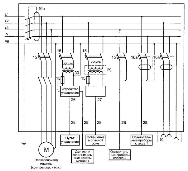 10 - розетки для подсоединения электроприемников, используемых снаружи установки; 15 - устройство защиты от токов перегрузки (например, автоматический выключатель или предохранитель); 16а - автоматический выключатель дифференциального тока на 30 мА для защиты оборудования, используемого снаружи установки; 16b - автоматический выключатель дифференциального тока для защиты оборудования, используемого внутри установки; 26 - устройство управления аттракционом; 27 - устройство управления специальным освещением (например, бегущие огни); 28 - вторичные цепи; 29 - безопасный разделительный трансформатор по ГОСТ 30030; 30 - понижающий трансформатор Рисунок А.4 - Пример подключения аттракциона к стационарной сети с системой заземления TN-S ПРИЛОЖЕНИЕ В(справочное) БиблиографияКлючевые слова: электроустановки зданий; временные сооружения; площадки для развлечений; аттракционы; защита от поражения электрическим током |