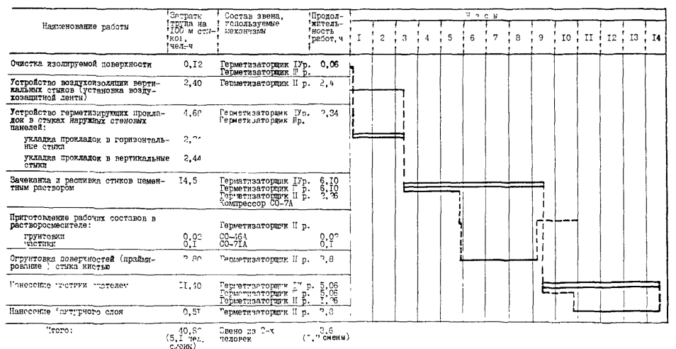 2.11. Огрунтовку стыкуемых поверхностей для улучшения сцепления герметизирующих мастик с поверхностью панелей, повышения долговечности мастичного шва производят как на строительной площадке, так и на заводе. Пропитка (огрунтовка) бетона в заводских условиях должна быть одноразовой. Подготовленные поверхности и грани панелей на строительной площадке следует огрунтовывать пистолетом-распылителем конструкции ПКБ НИИСП Госстроя УССР или кистью, перекрывая цементно-песчаную заделку с заходом на поверхность стеновых панелей не менее чем на 40 мм с каждой стороны. 2.12. Приготавливают рабочий состав герметизирующей мастики на стационарном смесителе. До начала работ следует проверить исправность смесителя включением его в режим холостого хода. Компоненты мастики распаковывают и загружают основной компонент в приемный бункер смесителя. Спустя 5 мин работы добавляют вулканизующий агент ПХДО. Компоненты мастики перемешивают в течение 10 - 15 мин. Качество перемешивания считается удовлетворительным при достижении равномерной окраски всего объема мастики. Готовый рабочий состав необходимо использовать в течение рабочей смены. 2.13. Наносить герметизирующую мастику следует на огрунтованную цементно-песчаную основу стыковых соединений с заходом на поверхность стеновых панелей не менее чем на 30 мм с каждой стороны. Общая ширина укладываемого ленточного слоя мастики должна составлять 100 - 120 мм и полностью перекрывать цементно-песчаную основу при толщине укладываемого слоя мастики 3 - 5 мм (см. рисунок). Наносить мастику на поверхность стыка можно пневмошприцом или шпателем после подвулканизации грунтовки. Интервал между нанесением грунтовки и мастики зависит от температуры наружного воздуха. Температура воздуха, °С -20 -15 -10 -5 0 5 10 15 20 25 Интервал между нанесением грунтовки и мастики, мин 120 100 90 75 60 50 45 40 30 30 2.14. Защитное покрытие (окраску) загерметизированных фасадных стыков наносят по уложенному и подвулканизованному слою герметизирующей мастики пистолетом-распылителем или кистью. Интервал времени между нанесением мастики и декоративно-защитного покрытия зависит от температуры наружного воздуха. Температура воздуха, °С -20 -10 -5 0 5 10 15 20 25 Интервал между нанесением грунтовки и декоративно-защитного покрытия, мин 6,0 5,0 4,5 4,0 3,5 3,0 3,0 2,5 2,5 2.15. График выполнения работ приведен в табл. 2, калькуляция трудовых затрат и заработной платы - в табл. 3. Таблица 3 Калькуляция трудовых затрат и заработной платы на герметизацию100 м стыков мастикой гермабутил-2М (УМ)