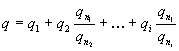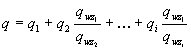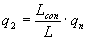 где lа, lb...li. - расстояние, м, по горизонтали каждого из источников группы, оси струй которых при направлении ветра в сторону рассматриваемого приемного устройства для н2аружного воздуха вписываются в его габариты; К - коэффициент, характеризующий уменьшение концентрации вредных веществ в струе, определяемый по приложению П; qn, qwz - предельно допустимые концентрации, мг/м3, вредных веществ соответственно по отношению к воздуху населенных мест и к воздуху рабочей зоны. Для одного источника и условного источника с выбросом вредных веществ, обладающих эффектом суммации действия, условная концентрация q, мг/м3, приведенная к одному веществу, определяется: а) при сравнении с q1 и q2 по формуле