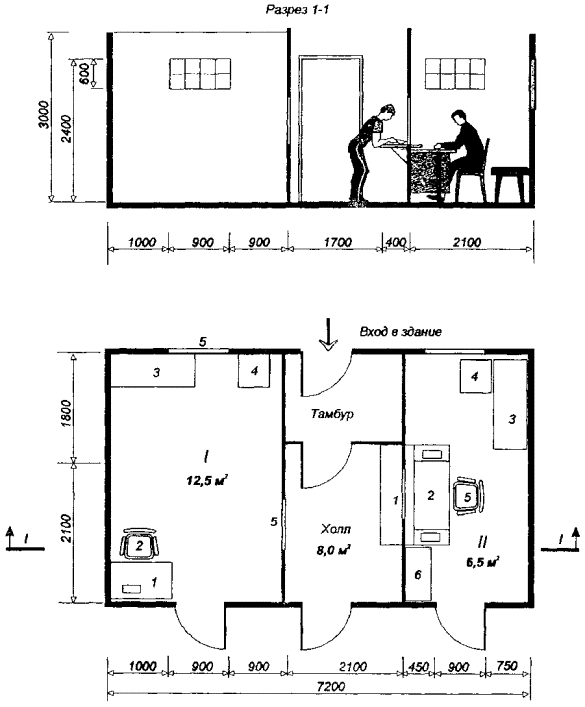 ПОСТЫ МИЛИЦИИ И НАДЗОРА (ВАХТЕРА) В ПРИЮТЕ, СОЦИАЛЬНОЙ ГОСТИНИЦЕ, ДОМЕ НОЧНОГО ПРЕБЫВАНИЯ, ЦЕНТРЕ СОЦИАЛЬНОЙ АДАПТАЦИИ I - пост милиции: 1 - стол с телефоном и настольной сигнализацией; 2 - стул; 3 - топчан; 4 - тумбочка; 5 - фрамуга (60 × 90 см) II - пост надзора: 1 - стойка; 2 - стол с телефоном и настольной сигнализацией; 3 - пожарная сигнализация; 4 - топчан для дежурного; 5 - стул; 6 - шкаф